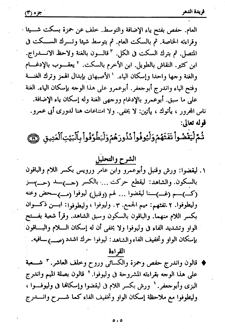 قالون واندرج حفص وحمزة والكسائى وروح وخلف العاشر. (3) شعبة على هذا الوجه بقراءته المشروحة فى وليوفوا. (2) قالون بصلة الميم واندرج البزى وأبو جعفر. (1) ورش بكسر اللام فى ليقضوا وإسكانها فى وليوفوا، وليطوفوا مع ملاحظة إسكان الواو وتخفيف الفاء كما شرح واندرج
