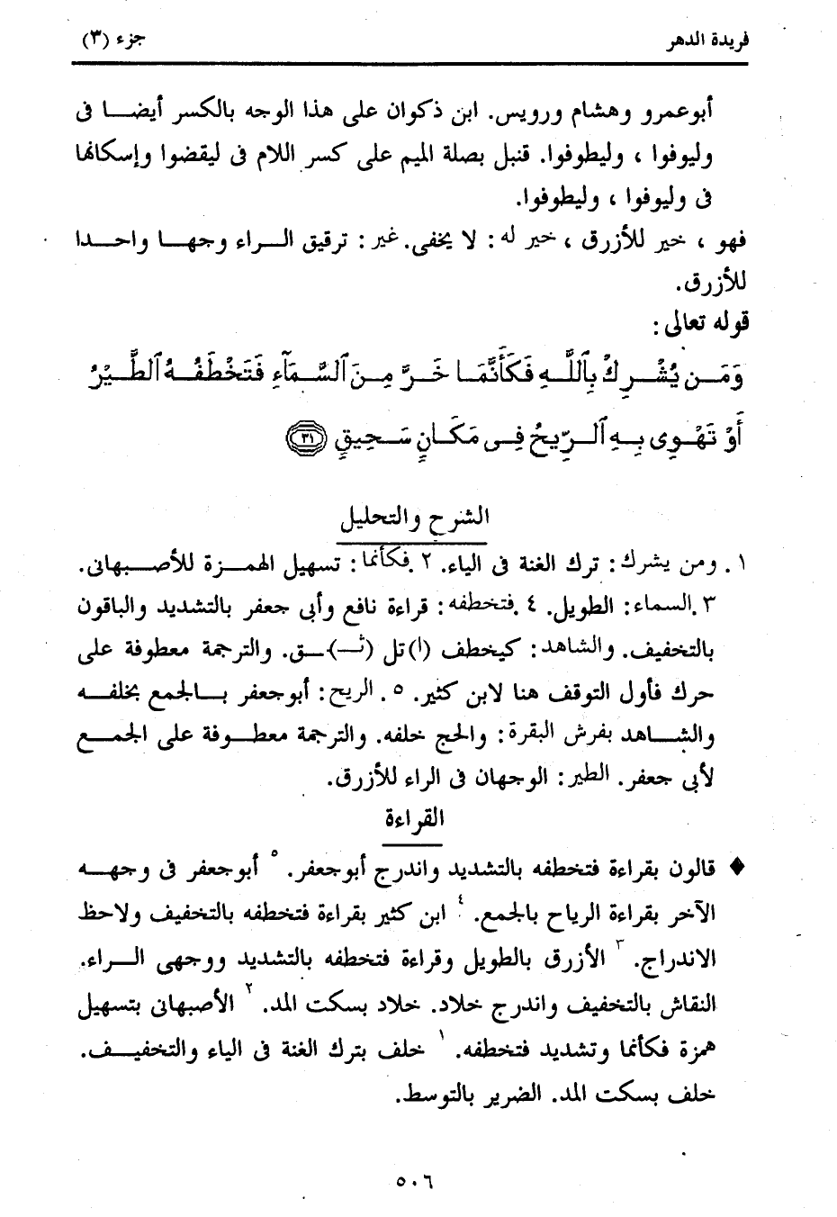 3. السماء: الطويل. 4. فتخطفه: قراءة نافع وأبى جعفر بالتشديد والباقون بالتخفيف. والشاهد: كيخطف (ا) تل (ث) ق. والترجمة معطوفة على حرك فأول التوقف هنا لابن كثير. 5. الريح: أبو جعفر بالجمع بخلفه والشاهد بفرش البقرة: والحج خلفه. والترجمة معطوفة على الجمع لأبى جعفر. الطير: الوجهان فى الراء للأزرق.