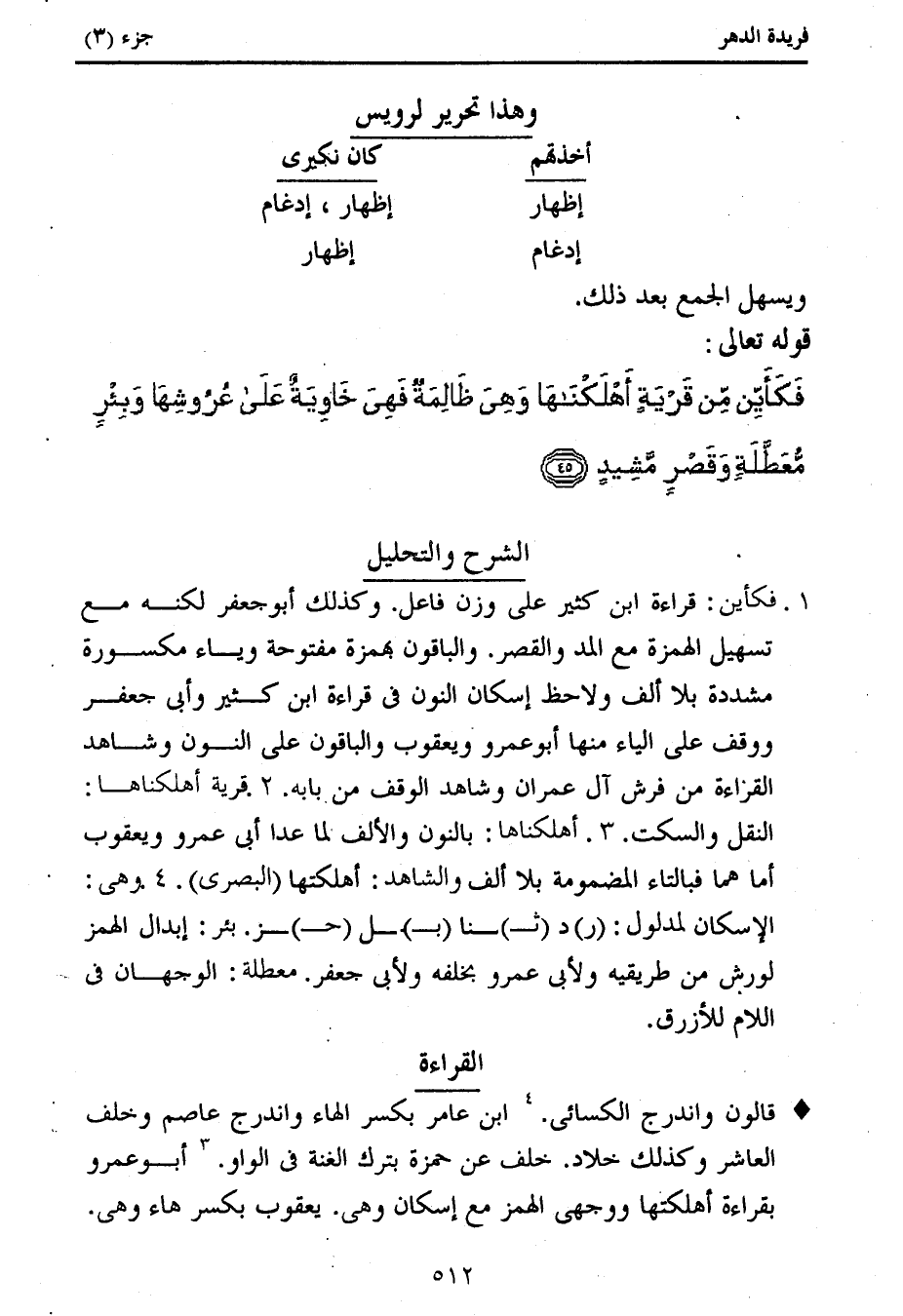 قالون واندرج الكسائى. (4) ابن عامر بكسر الهاء واندرج عاصم وخلف العاشر وكذلك خلاد. خلف عن حمزة بترك الغنة فى الواو. (3) أبو عمرو بقراءة أهلكتها ووجهى الهمز مع إسكان وهى. يعقوب بكسر هاء وهى.