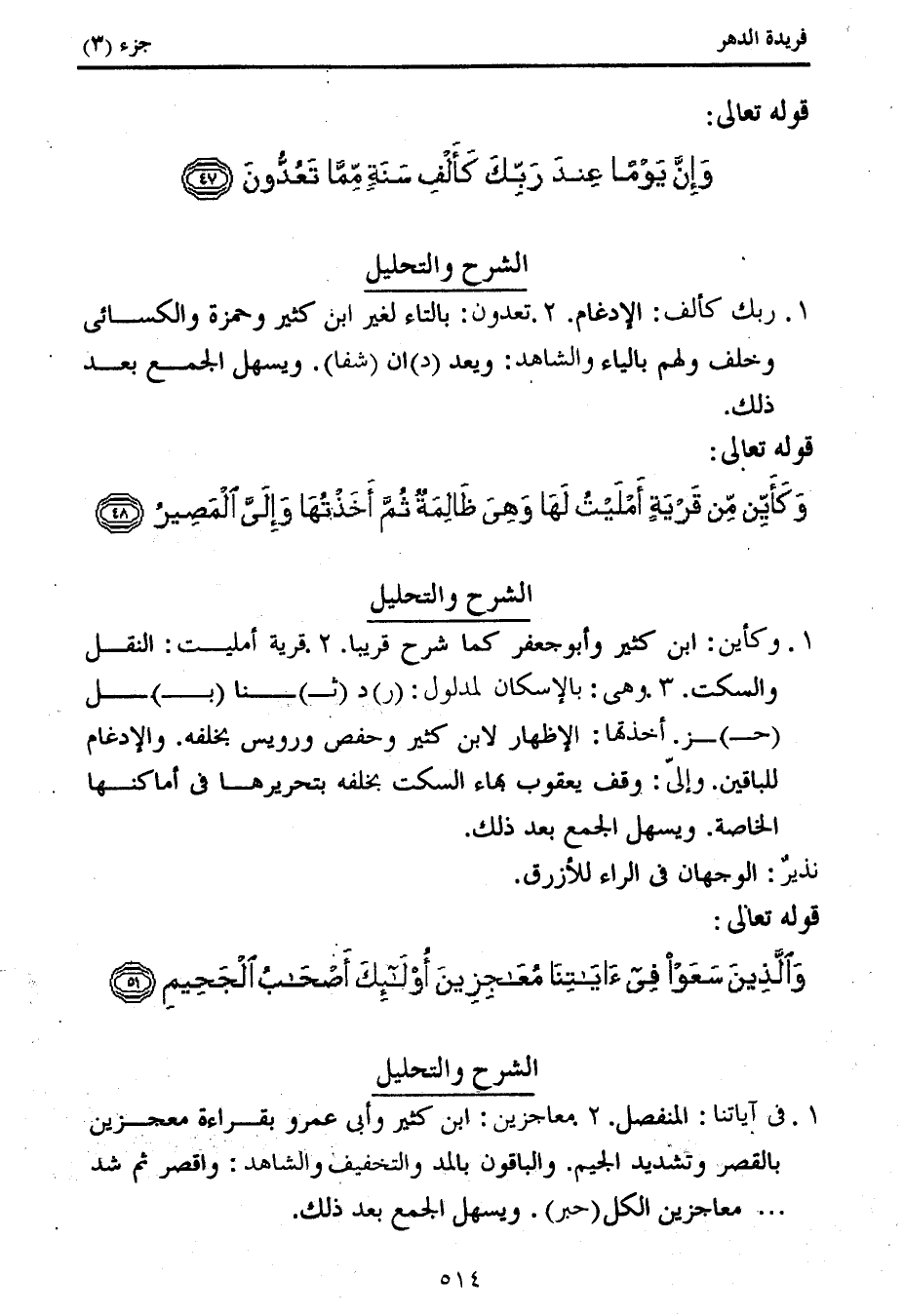 1. وكأين: ابن كثير وأبو جعفر كما شرح قريبا. 2. قرية أمليت: النقل والسكت. 3. وهى: بالإسكان لمدلول: (ر) د (ث) نا (ب) ل (ح) ز. أخذتها: الإظهار لابن كثير وحفص ورويس بخلفه. والإدغام للباقين. وإلىّ: وقف يعقوب بهاء السكت بخلفه بتحريرها فى أماكنها الخاصة. ويسهل الجمع بعد ذلك.