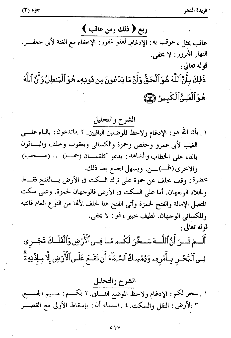 1. بأن الله هو: الإدغام ولاحظ الموضعين الباقيين. 2. ما تدعون: بالياء على الغيب لأبى عمرو وحفص وحمزة والكسائى ويعقوب وخلف والباقون بالتاء على الخطاب والشاهد: يدعو كلقمان (حما) ... (صحب) والاخرى (ظ) ن. ويسهل الجمع بعد ذلك.