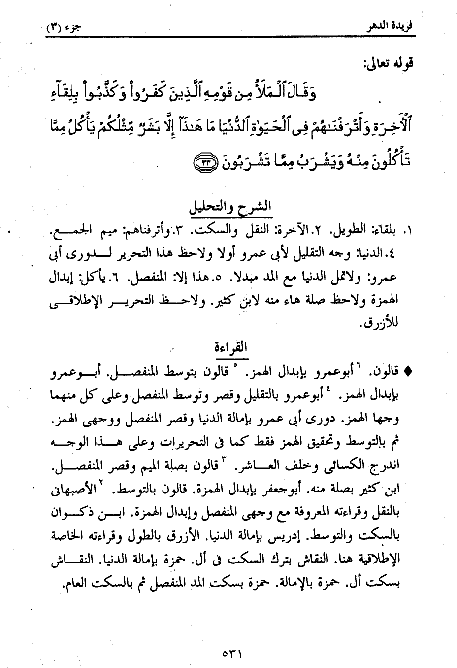 4. الدنيا: وجه التقليل لأبى عمرو أولا ولاحظ هذا التحرير لدورى أبى عمرو: ولا تمل الدنيا مع المد مبدلا. 5. هذا إلا: المنفصل. 6. يأكل: إبدال الهمزة ولاحظ صلة هاء منه لابن كثير. ولاحظ التحرير الإطلاقى للأزرق.