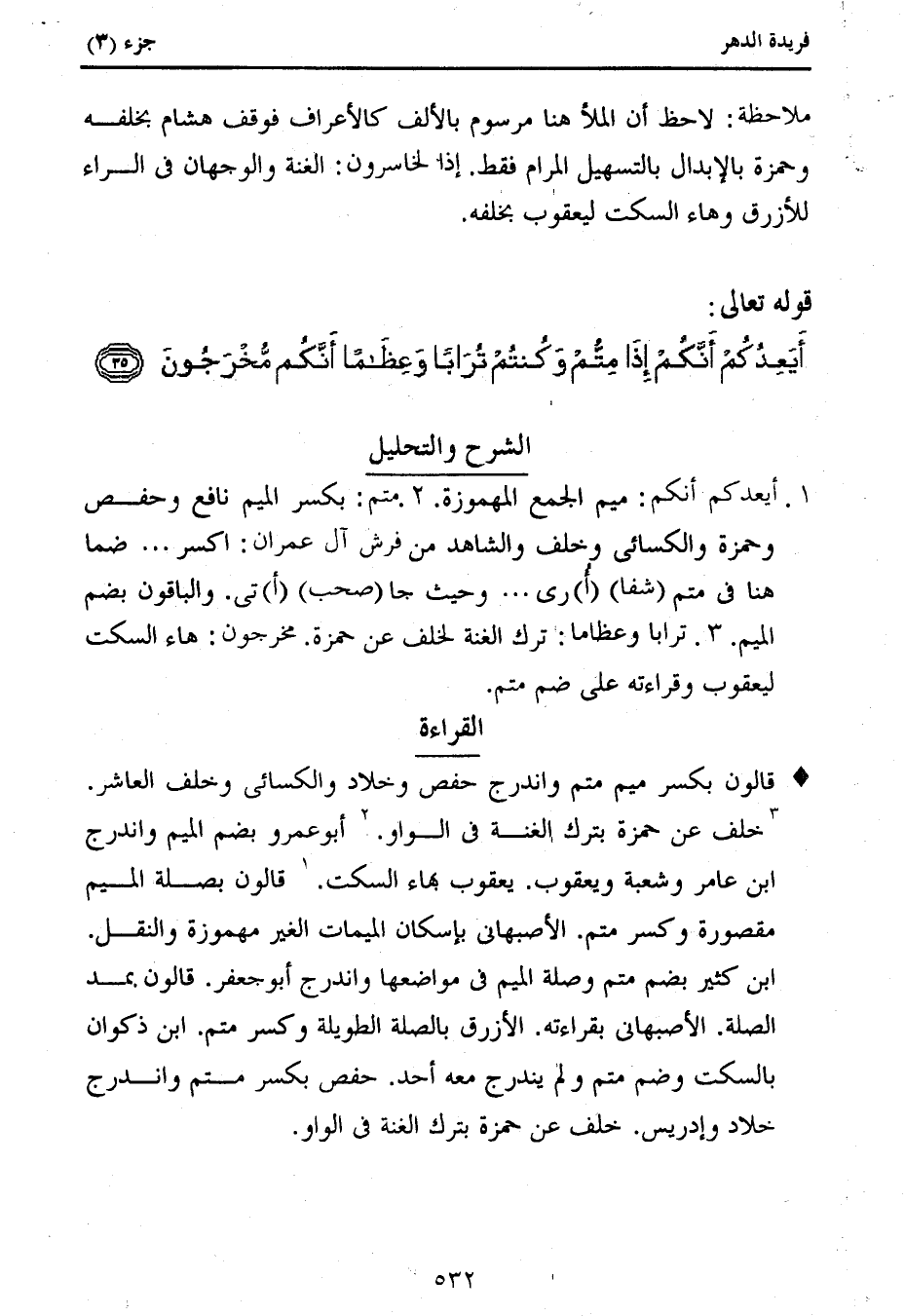 1. أيعدكم أنكم: ميم الجمع المهموزة. 2. متم: بكسر الميم نافع وحفص وحمزة والكسائى وخلف والشاهد من فرش آل عمران: اكسر ... ضما هنا فى متم (شفا) (أ) رى ... وحيث جا (صحب) (أ) تى. والباقون بضم الميم. 3. ترابا وعظاما: ترك الغنة لخلف عن حمزة. مخرجون: هاء السكت ليعقوب وقراءته على ضم متم.