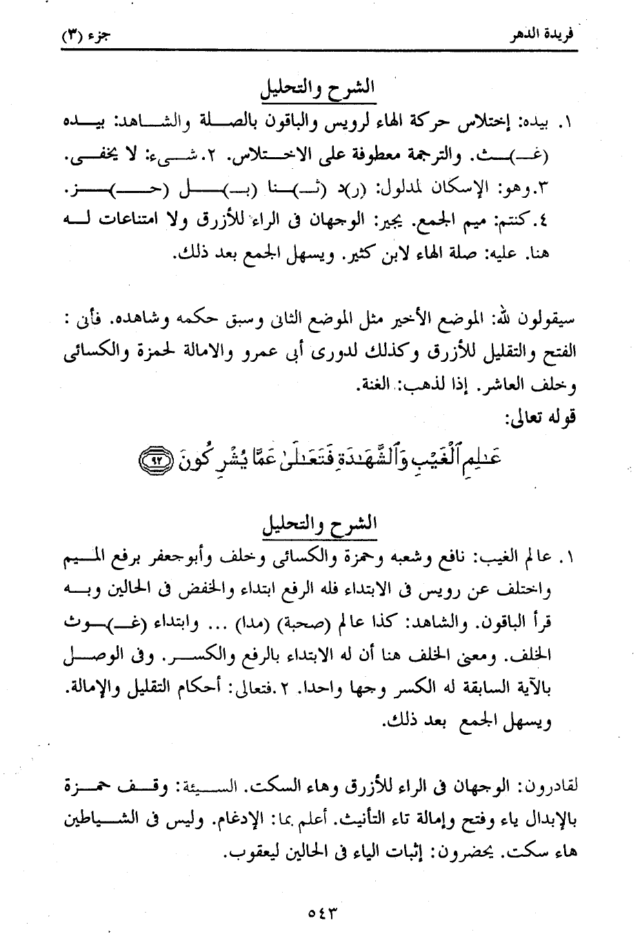 1. عالم الغيب: نافع وشعبة وحمزة والكسائى وخلف وأبو جعفر برفع الميم واختلف عن رويس فى الابتداء فله الرفع ابتداء والخفض فى الحالين وبه قرأ الباقون. والشاهد: كذا عالم (صحبة) (مدا) ... وابتداء (غ) وث الخلف. ومعنى الخلف هنا أن له الابتداء بالرفع والكسر. وفى الوصل بالآية السابقة له الكسر وجها واحدا. 2. فتعالى: أحكام التقليل والإمالة.