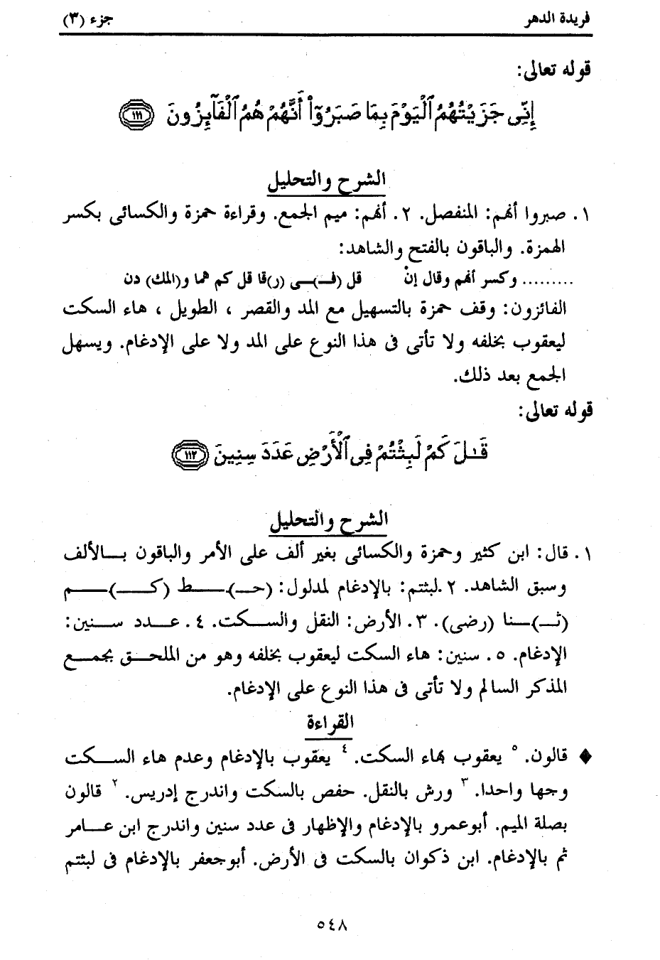 1. قال: ابن كثير وحمزة والكسائى بغير ألف على الأمر والباقون بالألف وسبق الشاهد. 2. لبثتم: بالإدغام لمدلول: (ح) ط (ك) م (ث) نا (رضى). 3. الأرض: النقل والسكت. 4. عدد سنين: