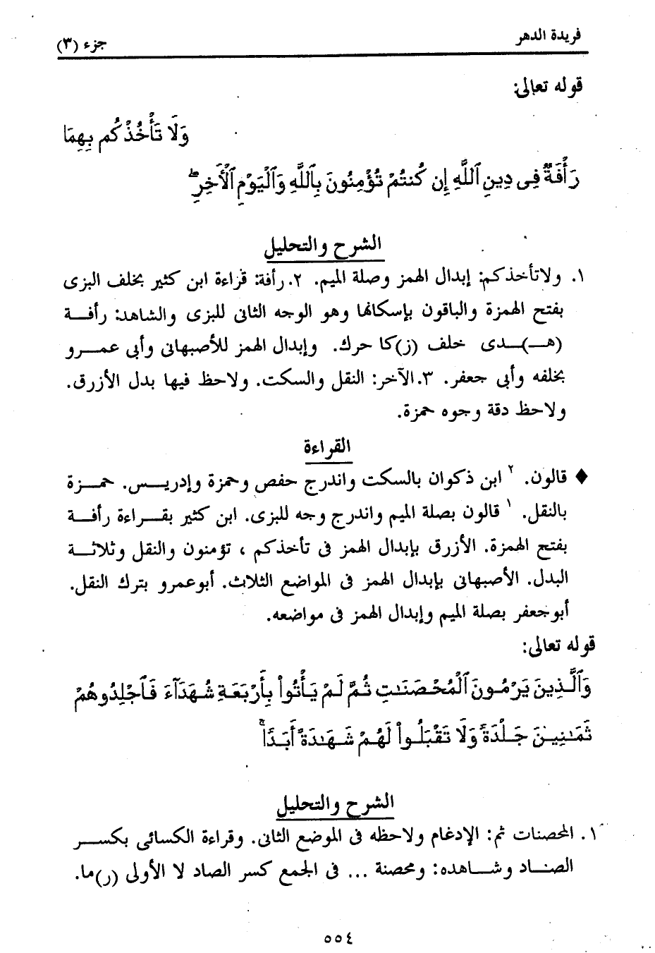 1. ولا تأخذكم: إبدال الهمز وصلة الميم. 2. رأفة: قراءة ابن كثير بخلف البزى بفتح الهمزة والباقون بإسكانها وهو الوجه الثانى للبزى والشاهد: رأفة (هـ) دى خلف (ز) كا حرك. وإبدال الهمز للأصبهانى وأبى عمرو بخلفه وأبى جعفر. 3. الآخر: النقل والسكت. ولاحظ فيها بدل الأزرق.