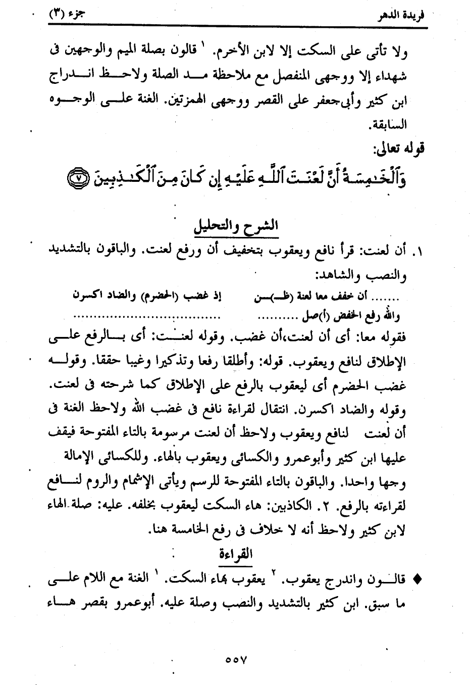 1. أن لعنت: قرأ نافع ويعقوب بتخفيف أن ورفع لعنت. والباقون بالتشديد والنصب والشاهد: