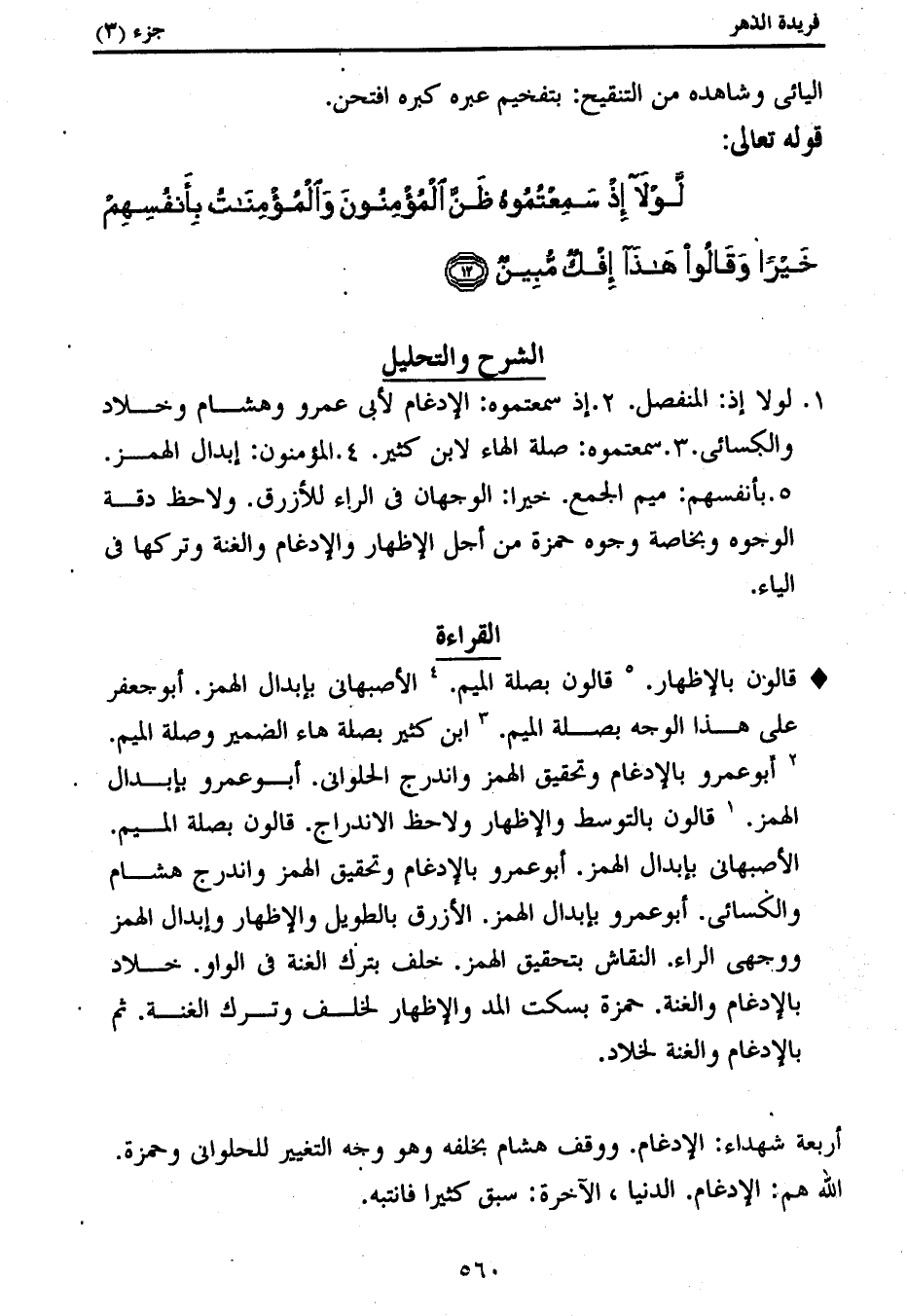1. لولا إذ: المنفصل. 2. إذ سمعتموه: الإدغام لأبى عمرو وهشام وخلاد والكسائى. 3. سمعتموه: صلة الهاء لابن كثير. 4. المؤمنون: إبدال الهمز.