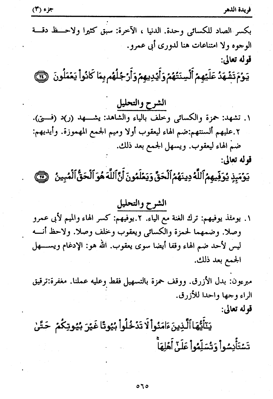 1. يومئذ يوفيهم: ترك الغنة مع الياء. 2. يوفيهم: كسر الهاء والميم لأبى عمرو وصلا. وضمهما لحمزة والكسائى ويعقوب وخلف وصلا. ولاحظ أنه ليس لأحد ضم الهاء وقفا أيضا سوى يعقوب. الله هو: الإدغام ويسهل الجمع بعد ذلك.
