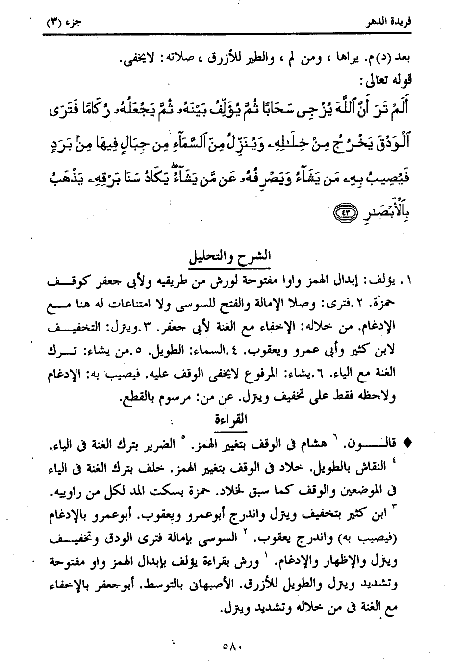 (3) ابن كثير بتخفيف وينزل واندرج أبو عمرو ويعقوب. أبو عمرو بالإدغام (فيصيب به) واندرج يعقوب. (2) السوسى بإمالة فترى الودق وتخفيف وينزل والإظهار والإدغام. (1) ورش بقراءة يؤلف بإبدال الهمز واو مفتوحة وتشديد وينزل والطويل للأزرق. الأصبهانى بالتوسط. أبو جعفر بالإخفاء مع الغنة فى من خلاله وتشديد وينزل.