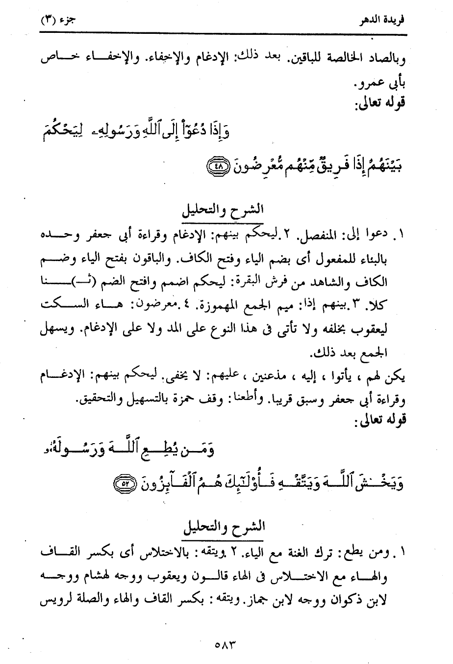 1. دعوا إلى: المنفصل. 2. ليحكم بينهم: الإدغام وقراءة أبى جعفر وحده بالبناء للمفعول أى بضم الياء وفتح الكاف. والباقون بفتح الياء وضم الكاف والشاهد من فرش البقرة: ليحكم اضمم وافتح الضم (ث) نا كلا. 3. بينهم إذا: ميم الجمع المهموزة. 4. معرضون: هاء السكت ليعقوب بخلفه ولا تأتى فى هذا النوع على المد ولا على الإدغام. ويسهل الجمع بعد ذلك.