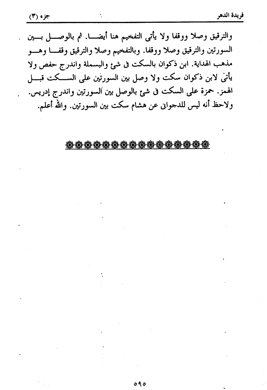 والترقيق وصلا ووقفا ولا يأتى التفخيم هنا أيضا. ثم بالوصل بين السورتين والترقيق وصلا ووقفا. وبالتفخيم وصلا والترقيق وقفا وهو مذهب الهداية. ابن ذكوان بالسكت فى شئ والبسملة واندرج حفص ولا يأتى لابن ذكوان سكت ولا وصل بين السورتين على السكت قبل الهمز. حمزة على السكت فى شئ بالوصل بين السورتين واندرج إدريس.