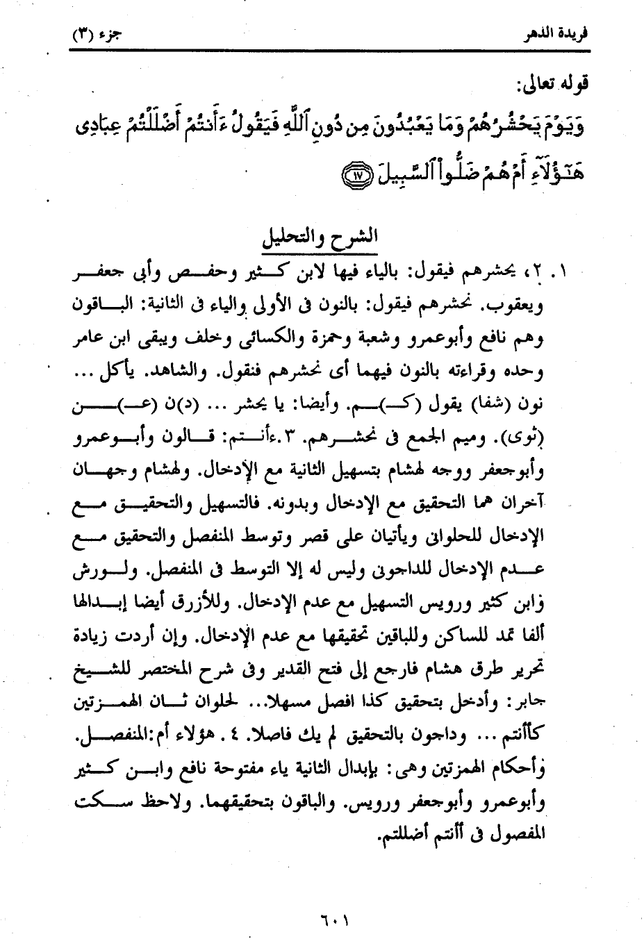 1. 2، يحشرهم فيقول: بالياء فيها لابن كثير وحفص وأبى جعفر ويعقوب. نحشرهم فيقول: بالنون فى الأولى والياء فى الثانية: الباقون وهم نافع وأبو عمرو وشعبة وحمزة والكسائى وخلف ويبقى ابن عامر وحده وقراءته بالنون فيهما أى نحشرهم فنقول. والشاهد. يأكل ...
