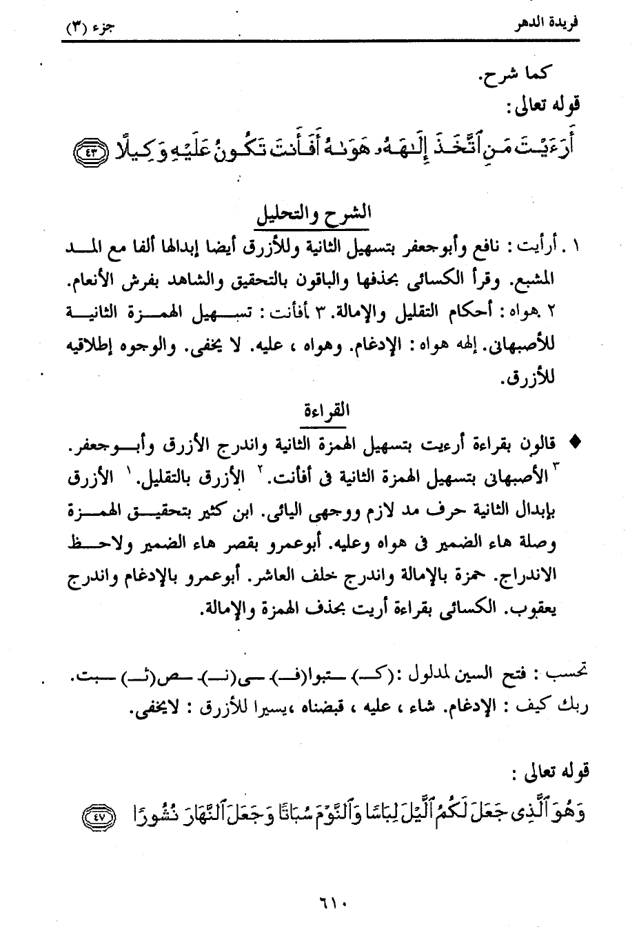(3) الأصبهانى بتسهيل الهمزة الثانية فى أفأنت. (2) الأزرق بالتقليل. (1) الأزرق بإبدال الثانية حرف مد لازم ووجهى اليائى. ابن كثير بتحقيق الهمزة وصلة هاء الضمير فى هواه وعليه. أبو عمرو بقصر هاء الضمير ولاحظ الاندراج. حمزة بالإمالة واندرج خلف العاشر. أبو عمرو بالإدغام واندرج يعقوب. الكسائى بقراءة أريت بحذف الهمزة والإمالة.