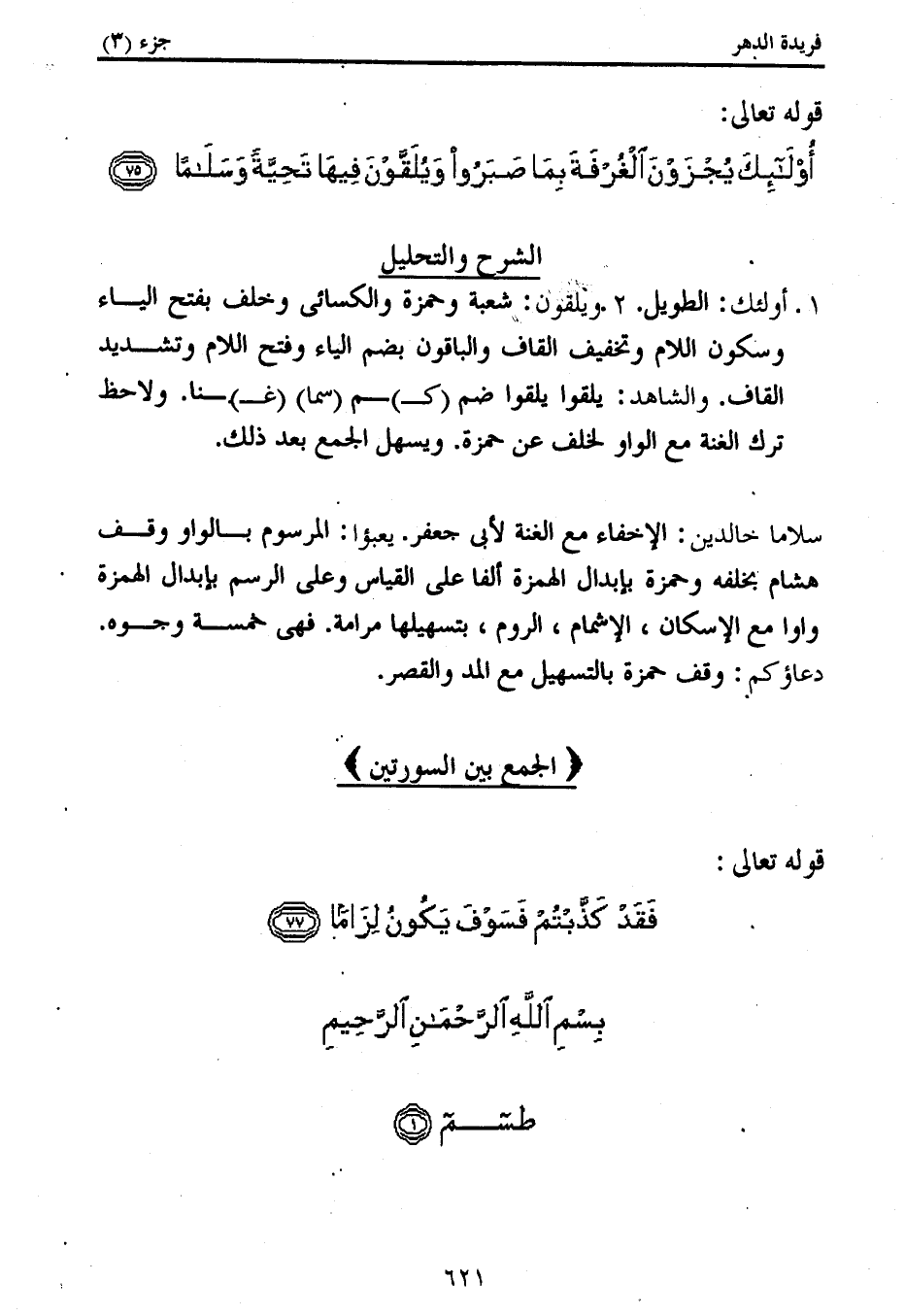 1. أولئك: الطويل. 2. ويلقون: شعبة وحمزة والكسائى وخلف بفتح الياء وسكون اللام وتخفيف القاف والباقون بضم الياء وفتح اللام وتشديد القاف. والشاهد: يلقوا يلقوا ضم (ك) م (سما) (غ) نا. ولاحظ ترك الغنة مع الواو لخلف عن حمزة. ويسهل الجمع بعد ذلك.