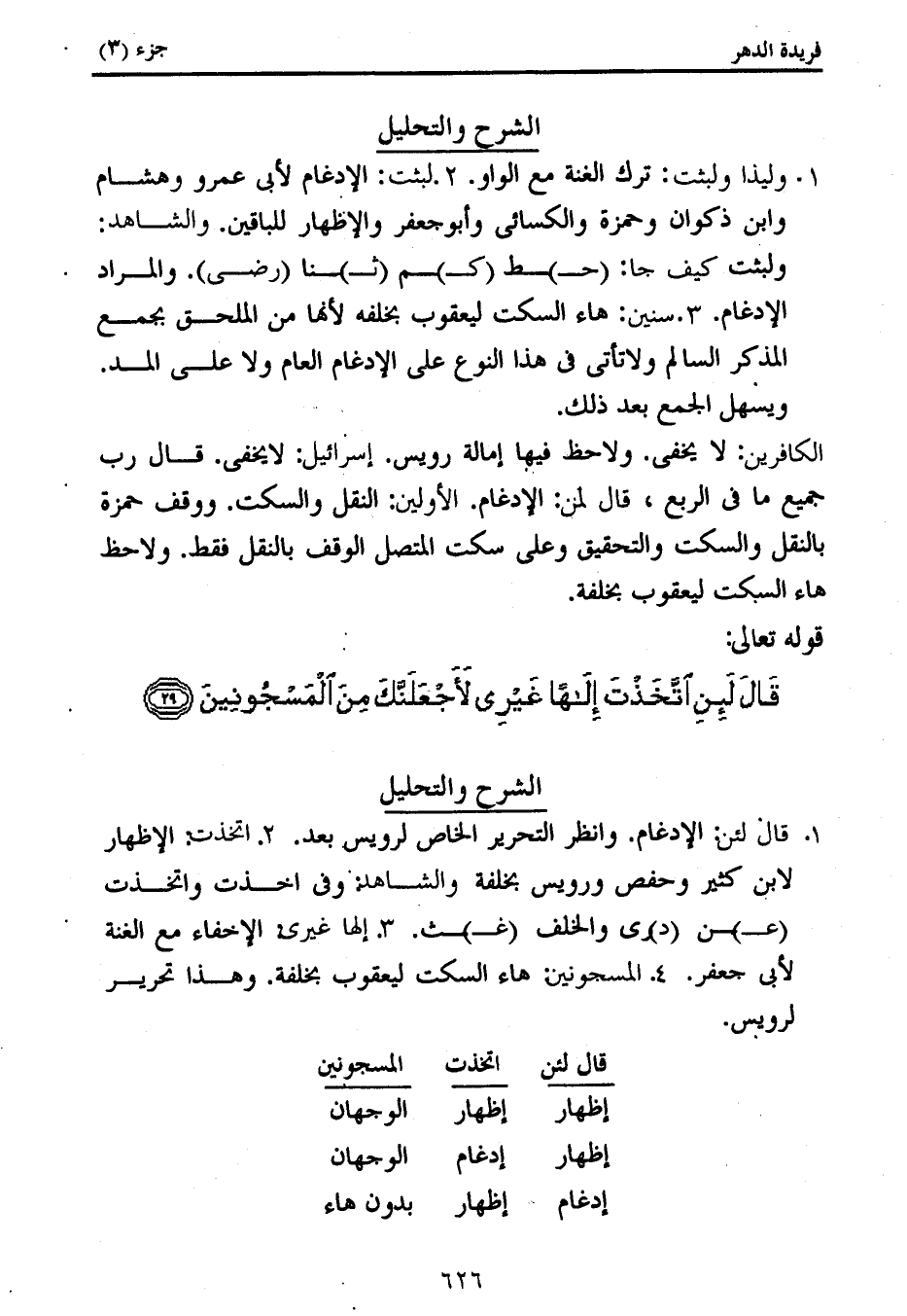 1. قال لئن: الإدغام. وانظر التحرير الخاص لرويس بعد. 2. اتخذت: الإظهار لابن كثير وحفص ورويس بخلفة والشاهد: وفى اخذت واتخذت (ع) ن (د) رى والخلف (غ) ث. 3. إلها غيرى: الإخفاء مع الغنة لأبى جعفر. 4. المسجونين: هاء السكت ليعقوب بخلفة. وهذا تحرير لرويس.
