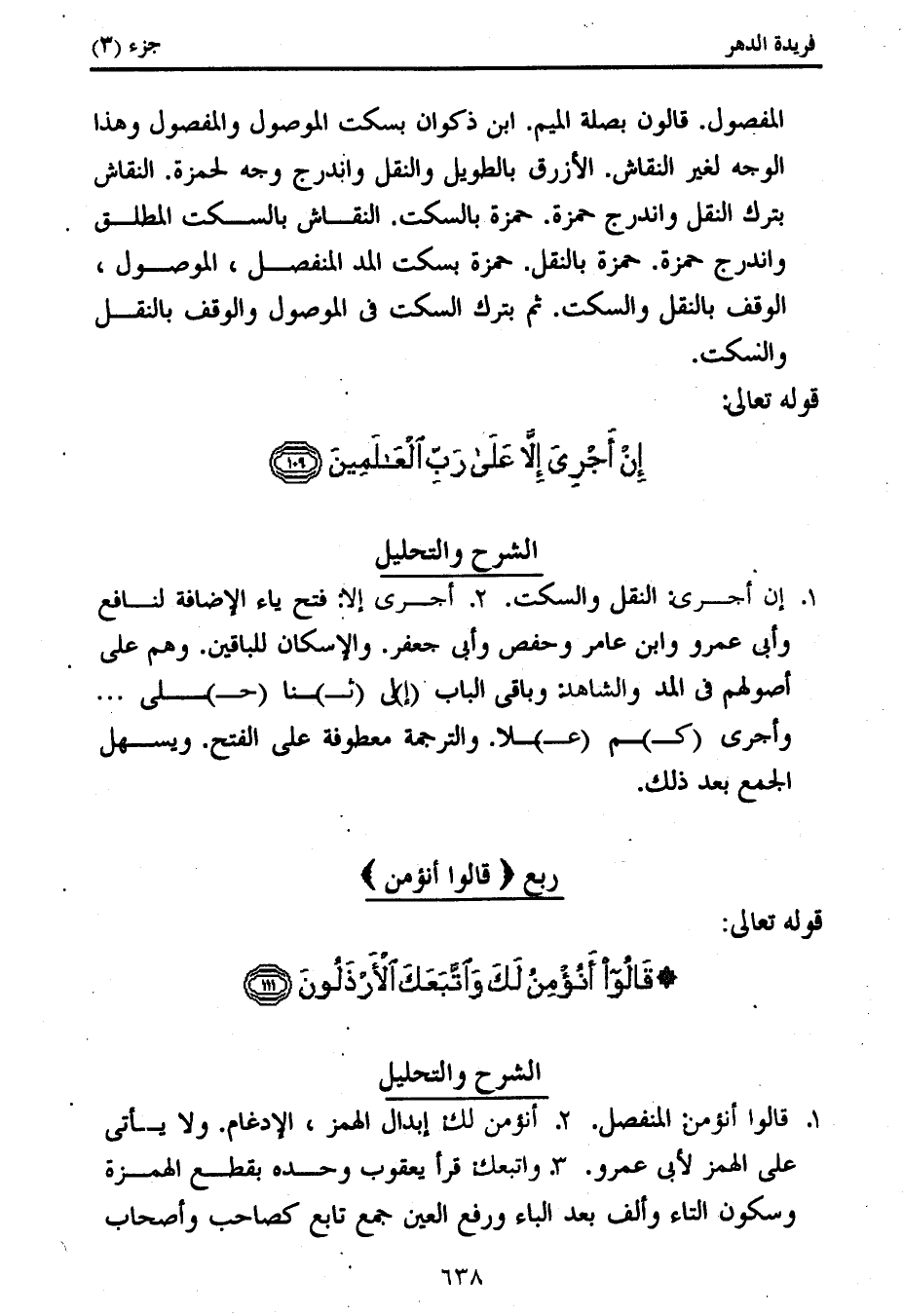 1. قالوا أنؤمن: المنفصل. 2. أنؤمن لك: إبدال الهمز، الإدغام. ولا يأتى على الهمز لأبى عمرو. 3. واتبعك: قرأ يعقوب وحده بقطع الهمزة وسكون التاء وألف بعد الباء ورفع العين جمع تابع كصاحب وأصحاب