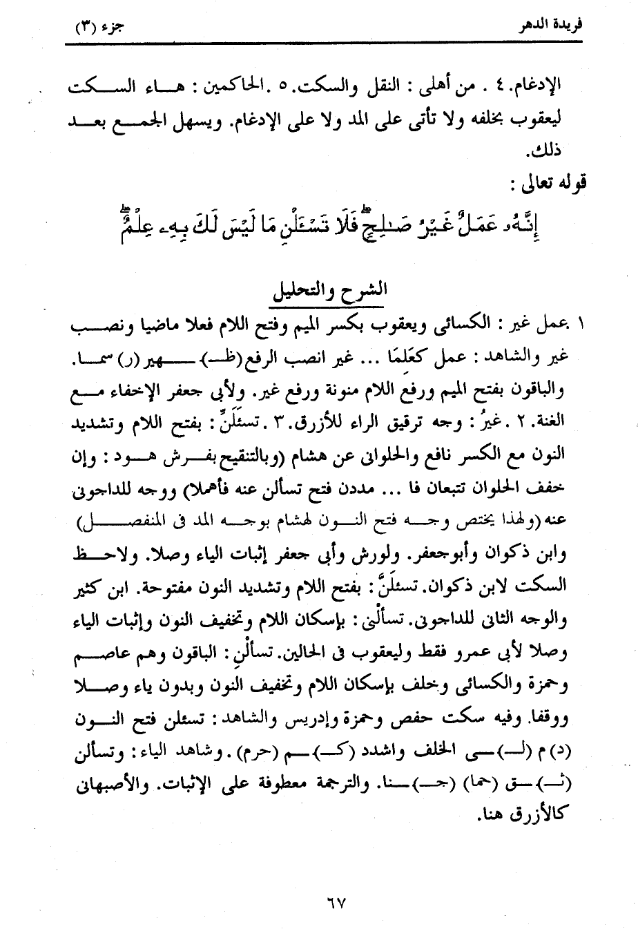 1. عمل غير: الكسائى ويعقوب بكسر الميم وفتح اللام فعلا ماضيا ونصب غير والشاهد: عمل كعلما ... غير انصب الرفع (ظ) هير (ر) سما.
