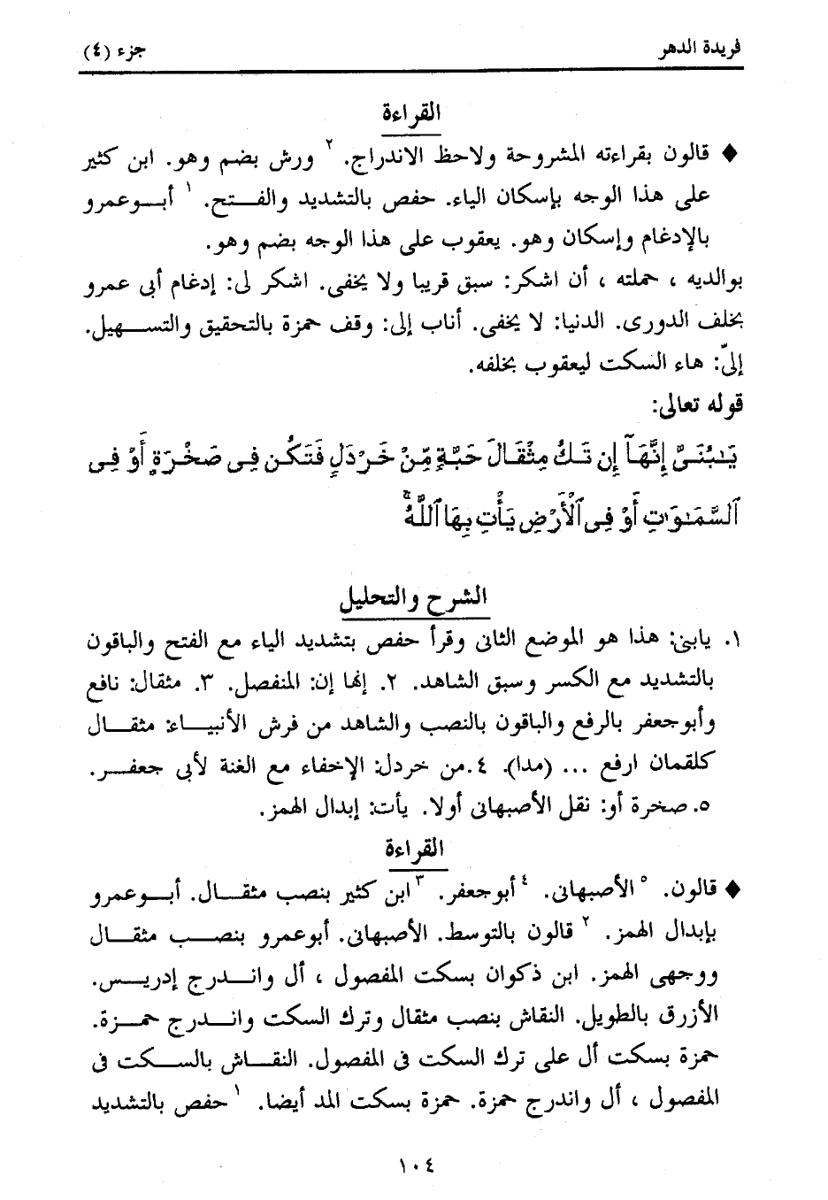 1. يا بنى: هذا هو الموضع الثانى وقرأ حفص بتشديد الياء مع الفتح والباقون بالتشديد مع الكسر وسبق الشاهد. 2. إنها إن: المنفصل. 3. مثقال: نافع وأبو جعفر بالرفع والباقون بالنصب والشاهد من فرش الأنبياء: مثقال كلقمان ارفع ... (مدا). 4. من خردل: الإخفاء مع الغنة لأبى جعفر.