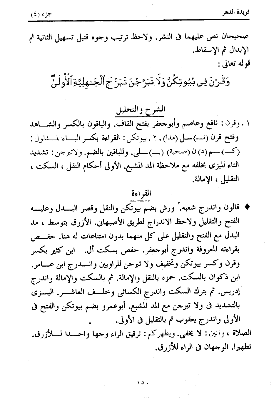 ابن ذكوان بالسكت. حمزة بالنقل والإمالة. ثم بالسكت والإمالة واندرج إدريس. ثم بترك السكت واندرج الكسائى وخلف العاشر. البزى بالتشديد فى ولا تبرجن مع المد المشبع. أبو عمرو بضم بيوتكن والفتح فى الأولى واندرج يعقوب ثم بالتقليل فى الأولى.