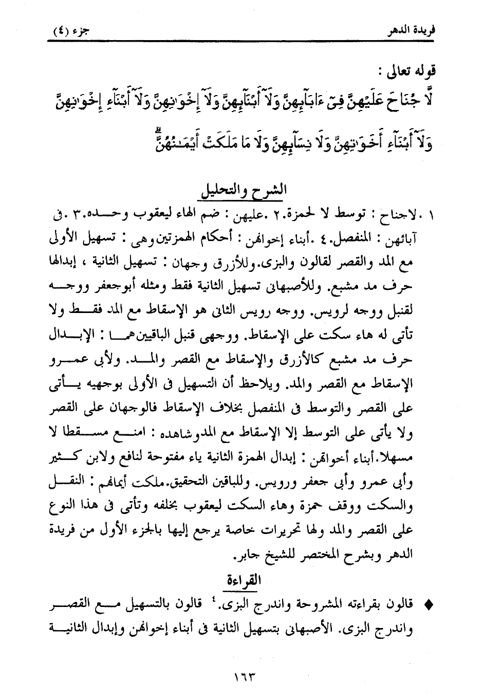 1. لا جناح: توسط لا لحمزة. 2. عليهن: ضم الهاء ليعقوب وحده. 3. فى آبائهن: المنفصل. 4. أبناء إخوانهن: أحكام الهمزتين وهى: تسهيل الأولى مع المد والقصر لقالون والبزى. وللأزرق وجهان: تسهيل الثانية، إبدالها حرف مد مشبع. وللأصبهانى تسهيل الثانية فقط ومثله أبو جعفر ووجه لقنبل ووجه لرويس. ووجه رويس الثانى هو الإسقاط مع المد فقط ولا تأتى له هاء سكت على الإسقاط. ووجهى قنبل الباقيين هما: الإبدال حرف مد مشبع كالأزرق والإسقاط مع القصر والمد. ولأبى عمرو الإسقاط مع القصر والمد. ويلاحظ أن التسهيل فى الأولى بوجهيه يأتى على القصر والتوسط فى المنفصل بخلاف الإسقاط فالوجهان على القصر ولا يأتى على التوسط إلا الإسقاط مع المد وشاهده: امنع مسقطا لا مسهلا. أبناء أخواتهن: إبدال الهمزة الثانية ياء مفتوحة لنافع ولابن كثير وأبى عمرو وأبى جعفر ورويس. وللباقين التحقيق. ملكت أيمانهم: النقل والسكت ووقف حمزة وهاء السكت ليعقوب بخلفه وتأتى فى هذا النوع على القصر والمد ولها تحريرات خاصة يرجع إليها بالجزء الأول من فريدة الدهر وبشرح المختصر للشيخ جابر.