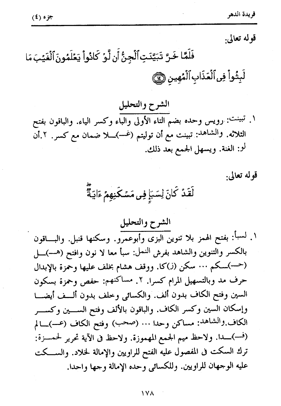 1. لسبأ: بفتح الهمز بلا تنوين البزى وأبو عمرو. وسكنها قنبل. والباقون بالكسر والتنوين والشاهد بفرش النمل: سبأ معا لا نون وافتح (هـ) ل (ح) كم ... سكن (ز) كا. ووقف هشام بخلف عليها وحمزة بالإبدال حرف مد وبالتسهيل المرام كسرا. 2. مساكنهم: حفص وحمزة بسكون السين وفتح الكاف بدون ألف. والكسائى وخلف بدون ألف أيضا وإسكان السين وكسر الكاف. والباقون بالألف وفتح السين وكسر الكاف. والشاهد: مساكن وحدا ... (صحب) وفتح الكاف (ع) الم (ف) دا. ولاحظ ميم الجمع المهموزة. ولاحظ فى الآية تحرير لحمزة: