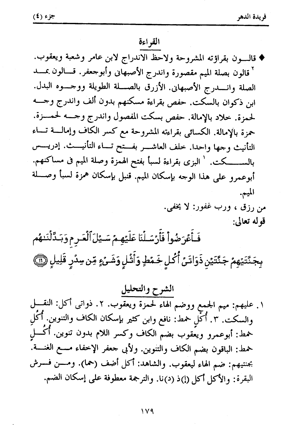 1. عليهم: ميم الجمع وضم الهاء لحمزة ويعقوب. 2. ذواتى أكل: النقل والسكت. 3. أكل خمط: نافع وابن كثير بإسكان الكاف والتنوين. أكل خمط: أبو عمرو ويعقوب بضم