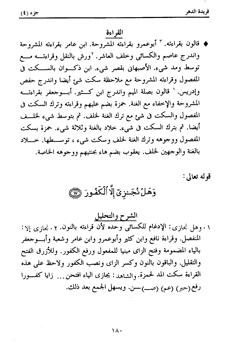 المنفصل. وقراءة نافع وابن كثير وأبو عمرو وابن عامر وشعبة وأبو جعفر بالياء المضمومة وفتح الزاى مبنيا للمفعول ورفع الكفور. وللأزرق الفتح والتقليل. والباقون بالنون وكسر الزاى ونصب الكفور ولاحظ على هذه القراءة سكت المد لحمزة. والشاهد: يجازى الياء افتحن ... زاء كفورا رفع (حبر) (عم) (ص) ن. ويسهل الجمع بعد ذلك.