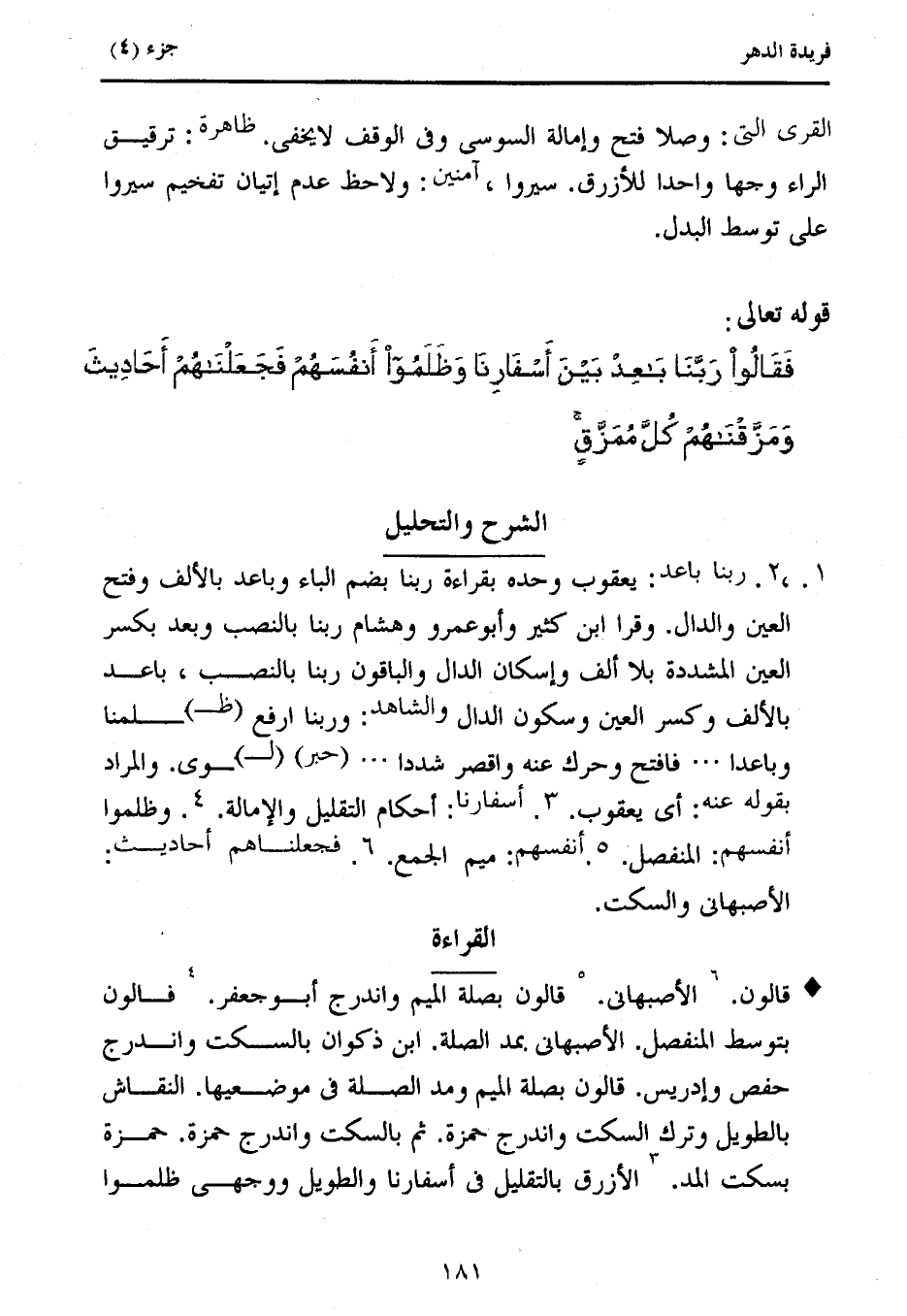 1.، 2. ربنا باعد: يعقوب وحده بقراءة ربنا بضم الباء وباعد بالألف وفتح العين والدال. وقرا ابن كثير وأبو عمرو وهشام ربنا بالنصب وبعد بكسر العين المشددة بلا ألف وإسكان الدال والباقون ربنا بالنصب، باعد بالألف وكسر العين وسكون الدال والشاهد: وربنا ارفع (ظ) لمنا وباعدا ... فافتح وحرك عنه واقصر شددا ... (حبر) (ل) وى. والمراد بقوله عنه: أى يعقوب. 3. أسفارنا: أحكام التقليل والإمالة. 4. وظلموا أنفسهم: المنفصل. 5. أنفسهم: ميم الجمع. 6. فجعلناهم أحاديث: