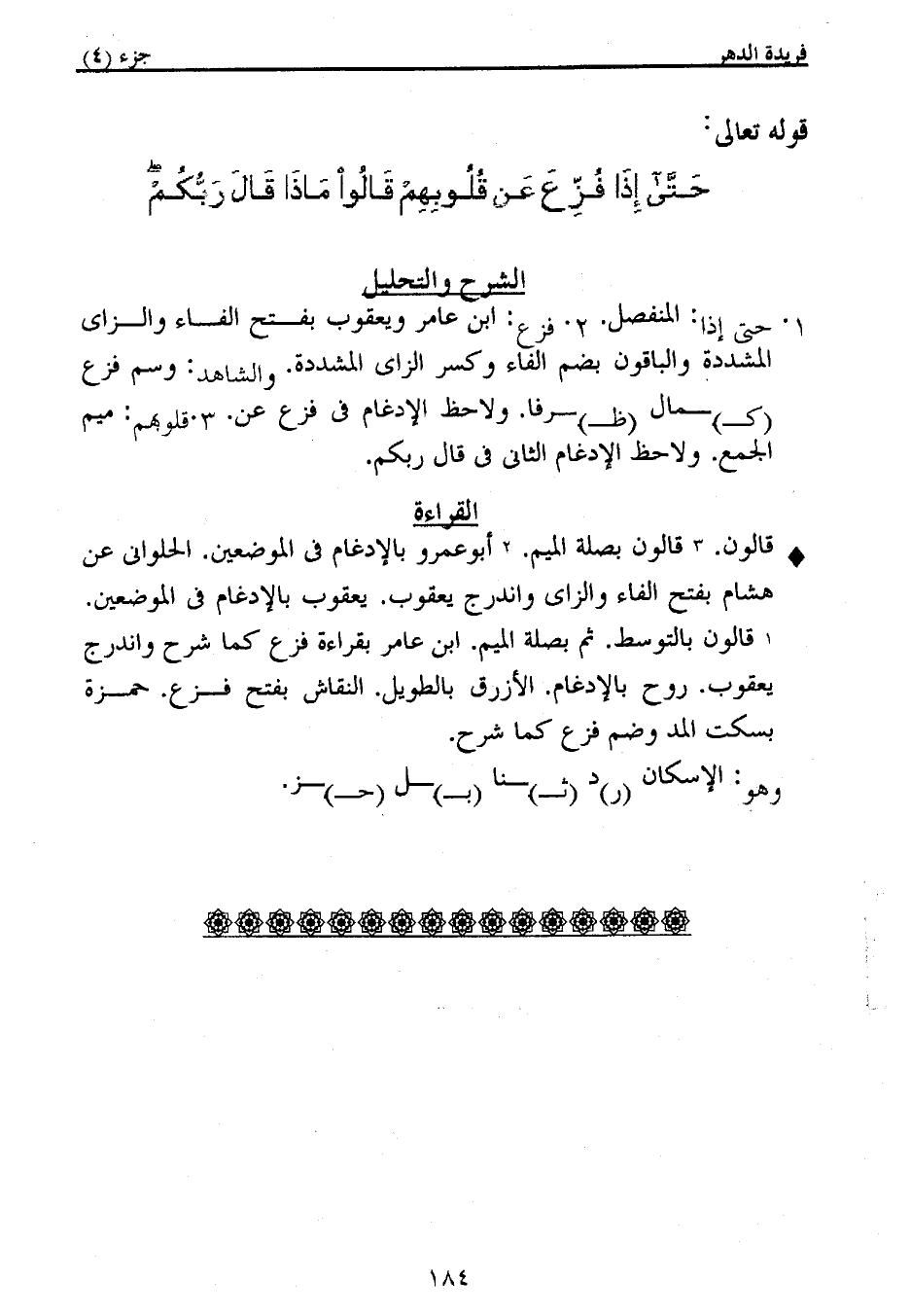 1. حتى إذا: المنفصل. 2. فزع: ابن عامر ويعقوب بفتح الفاء والزاى المشددة والباقون بضم الفاء وكسر الزاى المشددة. والشاهد: وسم فزع (ك) مال (ظ) رفا. ولاحظ الإدغام فى فزع عن. 3. قلوبهم: ميم الجمع. ولاحظ الإدغام الثانى فى قال ربكم.