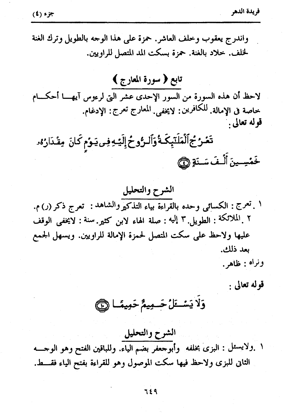 2. الملائكة: الطويل. 3. إليه: صلة الهاء لابن كثير. سنة: لا يخفى الوقف عليها ولاحظ على سكت المتصل لحمزة الإمالة للراويين. ويسهل الجمع بعد ذلك.