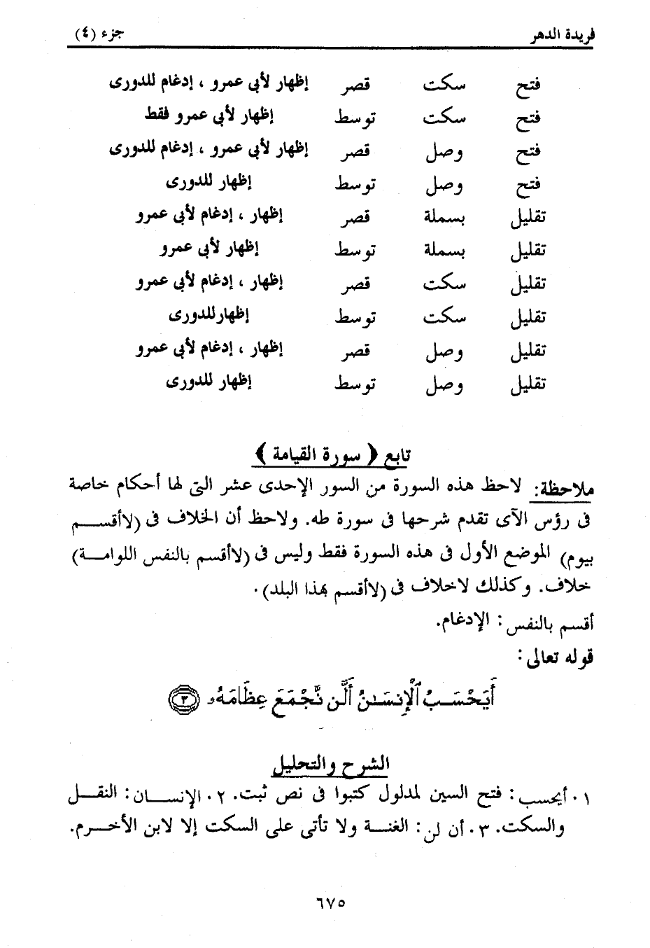 1. أيحسب: فتح السين لمدلول كتبوا فى نص ثبت. 2. الإنسان: النقل والسكت. 3. أن لن: الغنة ولا تأتى على السكت إلا لابن الأخرم.