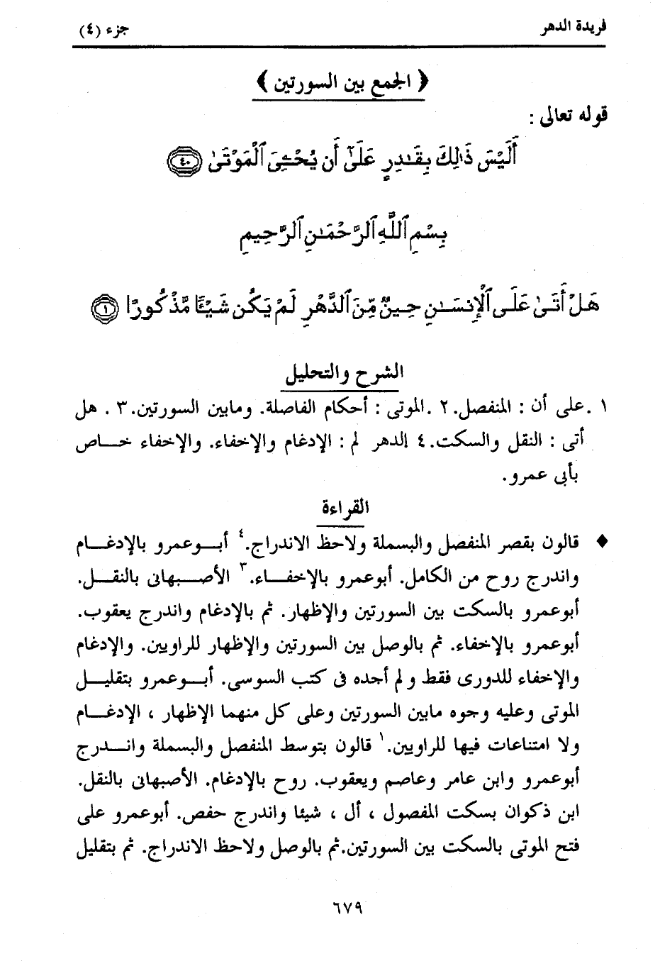 1. على أن: المنفصل. 2. الموتى: أحكام الفاصلة. وما بين السورتين. 3. هل أتى: النقل والسكت. 4. الدهر لم: الإدغام والإخفاء. والإخفاء خاص بأبى عمرو.