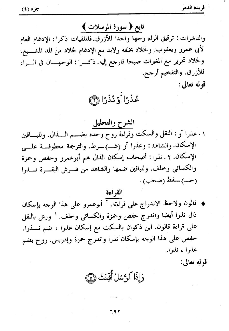 قالون ولاحظ الاندراج على قراءته. (2) أبو عمرو على هذا الوجه بإسكان ذال نذرا أيضا واندرج حفص وحمزة والكسائى وخلف. (1) ورش بالنقل على قراءة قالون. ابن ذكوان بالسكت مع إسكان عذرا، ضم نذرا.