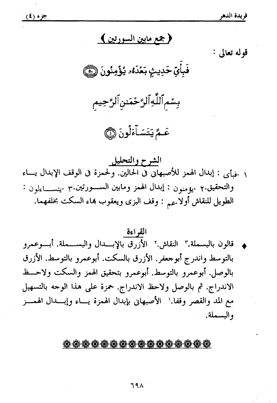 1. فبأى: إبدال الهمز للأصبهانى فى الحالين. ولحمزة فى الوقف الإبدال ياء والتحقيق. 2. يؤمنون: إبدال الهمز وما بين السورتين. 3. يتساءلون: