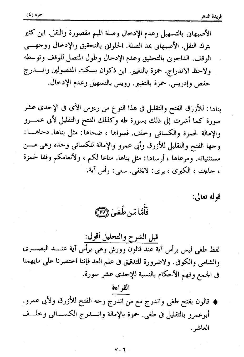 لفظ طغى ليس برأس آية عند قالون وورش وهى برأس آية عند البصرى والشامى والكوفى. ولا ضرورة للتدقيق فى علم العد فإننا اختصرنا على ما يهمنا فى الجمع وفهم الأحكام بالنسبة للاحدى عشر سورة.