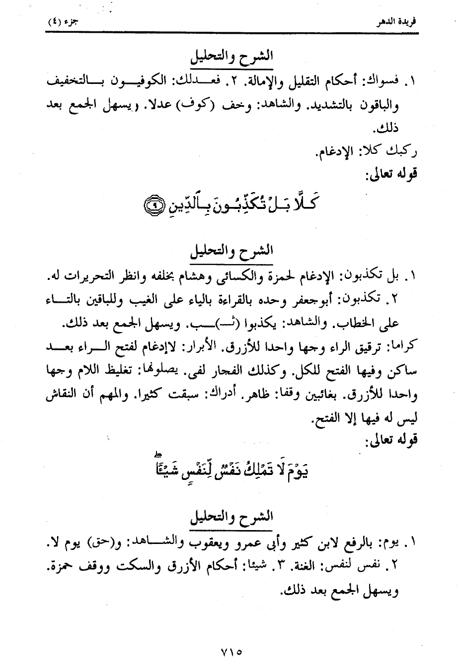 كراما: ترقيق الراء وجها واحدا للأزرق. الأبرار: لا إدغام لفتح الراء بعد ساكن وفيها الفتح للكل. وكذلك الفجار لفى. يصلونها: تغليظ اللام وجها واحدا للأزرق. بغائبين وقفا: ظاهر. أدراك: سبقت كثيرا. والمهم أن النقاش ليس له فيها إلا الفتح.