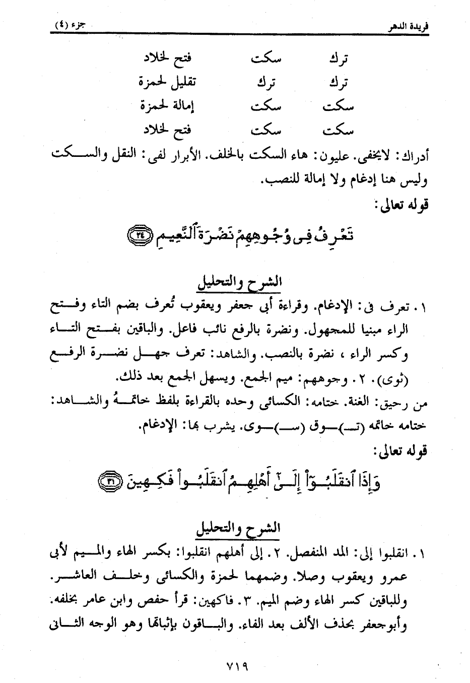 1. تعرف فى: الإدغام. وقراءة أبى جعفر ويعقوب تعرف بضم التاء وفتح الراء مبنيا للمجهول. ونضرة بالرفع نائب فاعل. والباقين بفتح التاء وكسر الراء، نضرة بالنصب. والشاهد: تعرف جهل نضرة الرفع (ثوى). 2. وجوههم: ميم الجمع. ويسهل الجمع بعد ذلك.