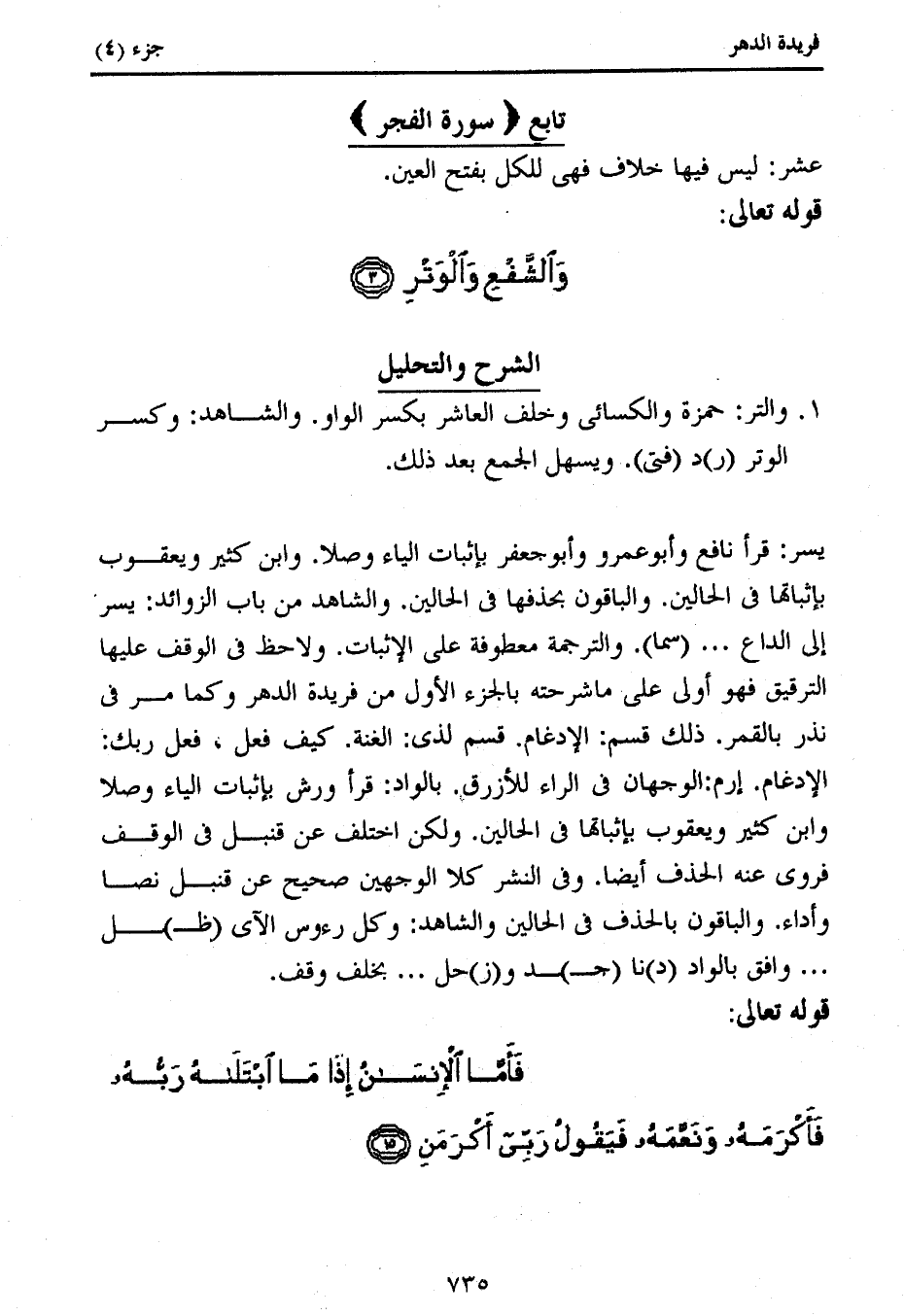 يسر: قرأ نافع وأبو عمرو وأبو جعفر بإثبات الياء وصلا. وابن كثير ويعقوب بإثباتها فى الحالين. والباقون بحذفها فى الحالين. والشاهد من باب الزوائد: يسر إلى الداع ... (سما). والترجمة معطوفة على الإثبات. ولاحظ فى الوقف عليها الترقيق فهو أولى على ما شرحته بالجزء الأول من فريدة الدهر وكما مر فى نذر بالقمر. ذلك قسم: الإدغام. قسم لذى: الغنة. كيف فعل، فعل ربك: