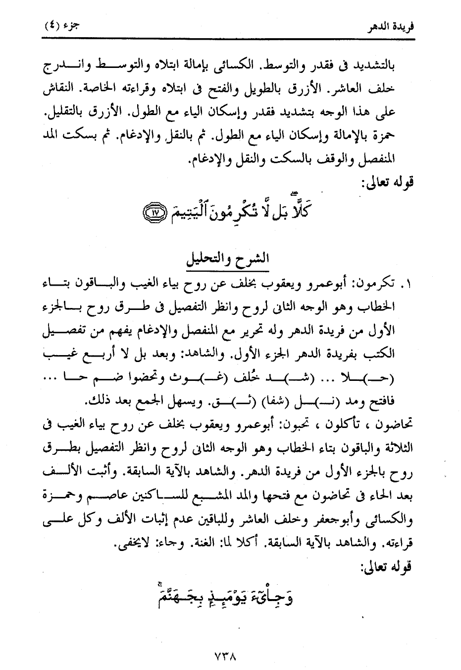 تحاضون، تأكلون، تحبون: أبو عمرو ويعقوب بخلف عن روح بياء الغيب فى الثلاثة والباقون بتاء الخطاب وهو الوجه الثانى لروح وانظر التفصيل بطرق روح بالجزء الأول من فريدة الدهر. والشاهد بالآية السابقة. وأثبت الألف بعد الحاء فى تحاضون مع فتحها والمد المشبع للساكنين عاصم وحمزة والكسائى وأبو جعفر وخلف العاشر وللباقين عدم إثبات الألف وكل على قراءته. والشاهد بالآية السابقة. أكلا لما: الغنة. وجاء: لا يخفى.
