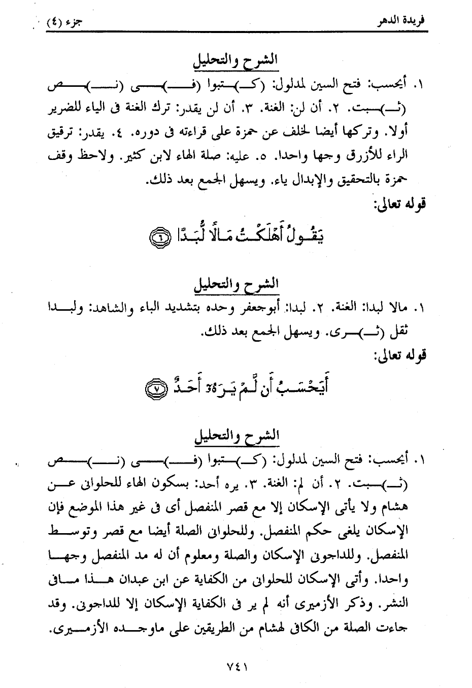 1. أيحسب: فتح السين لمدلول: (ك) تبوا (ف) ى (ن) ص (ث) بت. 2. أن لم: الغنة. 3. يره أحد: بسكون الهاء للحلوانى عن هشام ولا يأتى الإسكان إلا مع قصر المنفصل أى فى غير هذا الموضع فإن الإسكان يلغى حكم المنفصل. وللحلوانى الصلة أيضا مع قصر وتوسط المنفصل. وللداجونى الإسكان والصلة ومعلوم أن له مد المنفصل وجها واحدا. وأتى الإسكان للحلوانى من الكفاية عن ابن عبدان هذا ما فى النشر. وذكر الإزميري أنه لم ير فى الكفاية الإسكان إلا للداجونى. وقد جاءت الصلة من الكافى لهشام من الطريقين على ما وجده الإزميري.