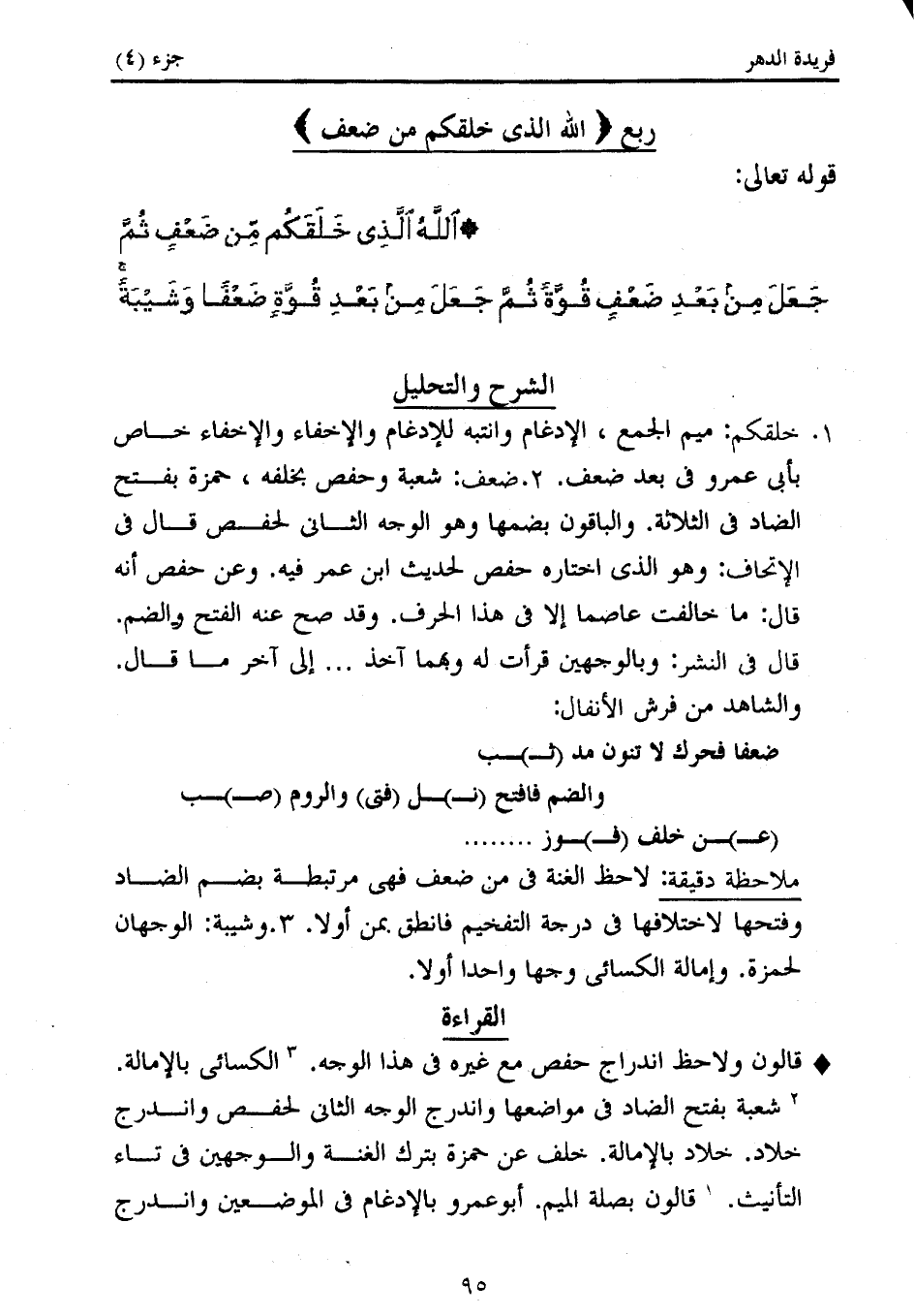1. خلقكم: ميم الجمع، الإدغام وانتبه للإدغام والإخفاء والإخفاء خاص بأبى عمرو فى بعد ضعف. 2. ضعف: شعبة وحفص بخلفه، حمزة بفتح الضاد فى الثلاثة. والباقون بضمها وهو الوجه الثانى لحفص قال فى الإتحاف: وهو الذى اختاره حفص لحديث ابن عمر فيه. وعن حفص أنه قال: ما خالفت عاصما إلا فى هذا الحرف. وقد صح عنه الفتح والضم.