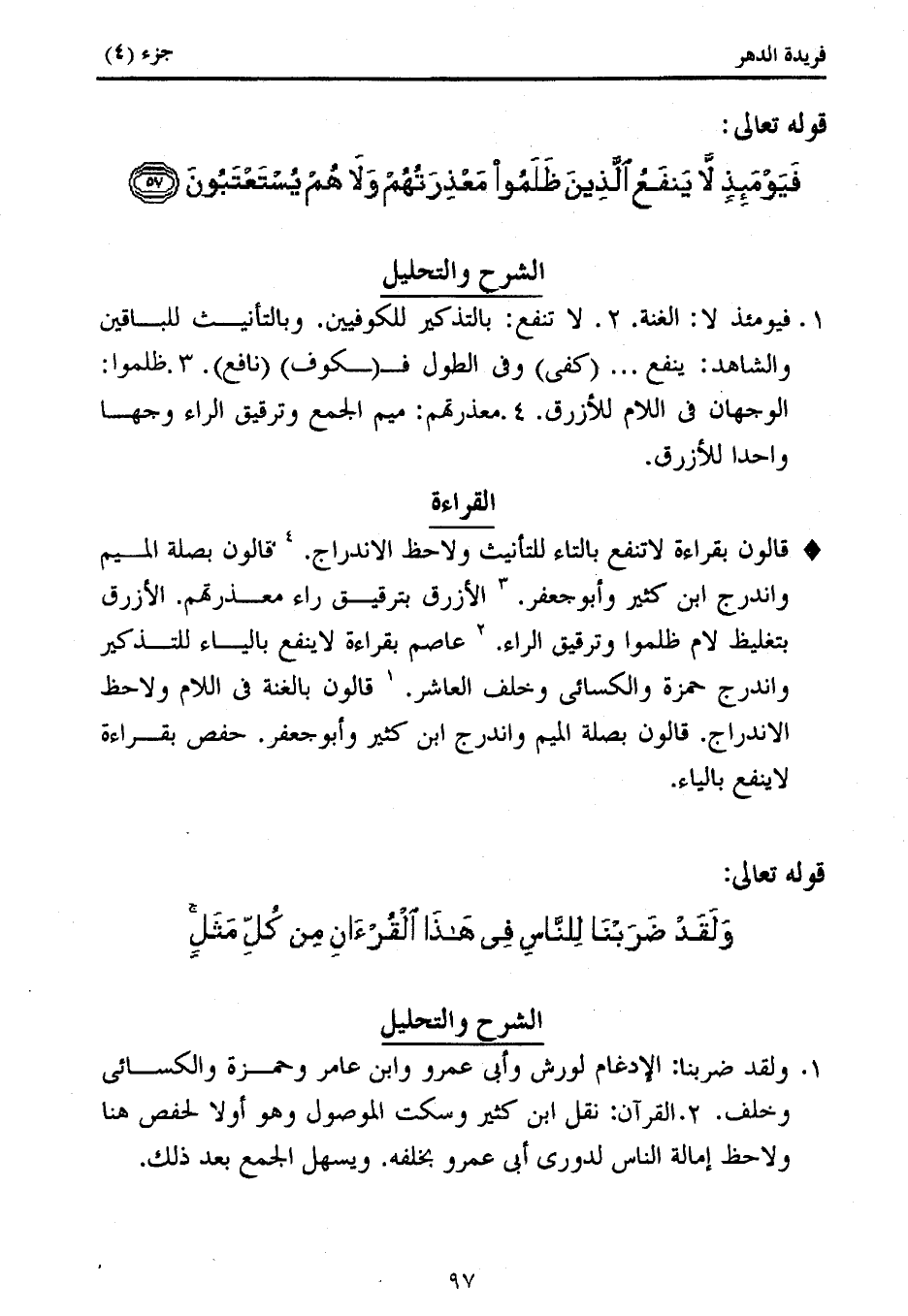قالون بقراءة لا تنفع بالتاء للتأنيث ولاحظ الاندراج. (4) قالون بصلة الميم واندرج ابن كثير وأبو جعفر. (3) الأزرق بترقيق راء معذرتهم. الأزرق بتغليظ لام ظلموا وترقيق الراء. (2) عاصم بقراءة لا ينفع بالياء للتذكير واندرج حمزة والكسائى وخلف العاشر. (1) قالون بالغنة فى اللام ولاحظ الاندراج. قالون بصلة الميم واندرج ابن كثير وأبو جعفر. حفص بقراءة لا ينفع بالياء.