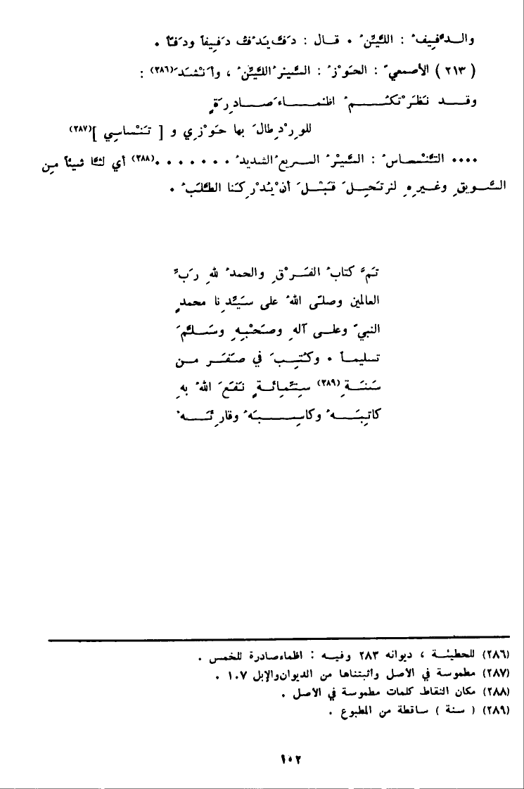(288) أَي لثَّا شَيْئا مِن السَّويقِ وغيرِهِ لنرتَحِلَ قَبْلَ أنْ يُدْرِكَنا الطَّلَبُ. تَمَّ كتابُ الفَرْقِ والحمدُ للهِ رَبِّ الْعَالمين وصلّى اللهُ على سَيِّدِنا محمدٍ النبيّ وعَلى آلهِ وصَحْبِهِ وسَلَّمَ تَسْلِيمًا. وكُتِبَ فِي صَفَر من سَنَةِ (289) سِتِّمائَةٍ نَفَعَ اللهُ بهِ كاتِبَهُ وكاسِبَهُ وقارِئَهُ