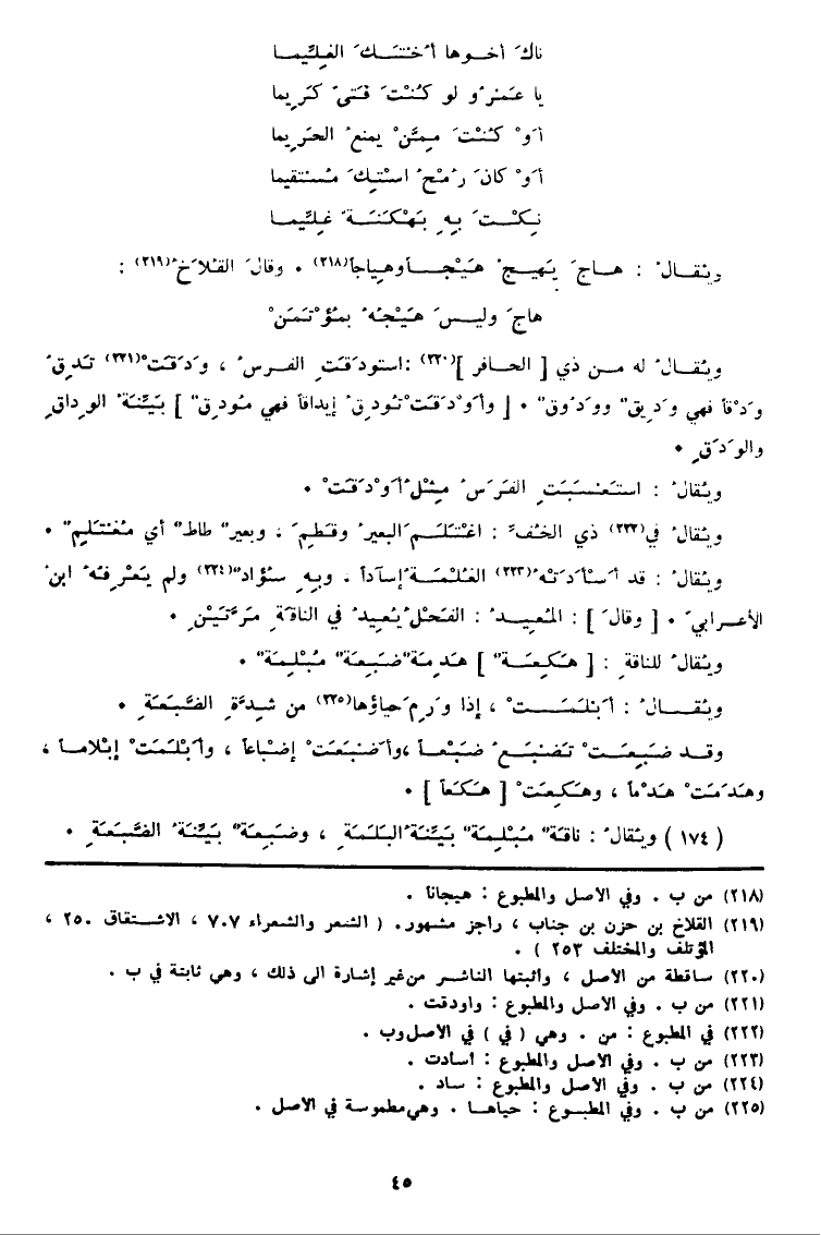 ناكَ أَخُوهَا أُخْتَكَ الغِلِّيما يَا عَمْرُو لَو كُنْتَ فَتىً كَرِيما أَوْ كُنْتَ مِمَّنْ يمنعُ الحَرِيما أَوْ كانَ رُمْحُ اسْتِكَ مُسْتقيما نِكْتَ بِهِ بَهْكَنَةً غِلِّيما ويُقالُ: هاجَ يضهيجُ هَيْجاً وهِياجاً (218) . وقالَ القُلاَخُ (219) : هاجَ وليسَ هَيْجُهُ بمُؤْتَمَنْ ويُقالُ لَهُ من ذِي [الحافرِ] (220) : استودَقَتِ الفرسُ، وَدَقَتْ (221) تَدِقُ وَدْقاً فَهِيَ وَدِيقٌ ووَدُوقٌ. [وأَوْدَقَتْ تُودِقُ إيداقاً فَهِيَ مُودِقٌ] بَيِّنَةُ الوِداقِ والوَدَقِ. ويُقالُ: استَعْسَبَتِ الفَرَسُ مِثْلُ أَوْدَقَتْ. ويُقالُ فِي (222) ذِي الخُفِّ: اغْتَلَمَ البعيرُ وقَطِمَ، وبعيرٌ طاطٌ أَي مُغْتَلِمٌ. ويُقالُ: قد أَسْأَدَتْهُ (223) الغُلْمَةُ إسآداً، وبِهِ سُؤادٌ (2249 وَلم يَعْرِفُهُ ابنُ الأعرابيّ. [وقالَ] : المُعِيدُ، الفَحْلُ يُعِيدُ فِي الناقَةِ مَرَّتَيْنِ. ويُقالُ للناقةِ: [هَكِعَةٌ] هَدِمَةٌ ضَبِعَةٌ مُبْلِمَةٌ. ويُقالُ: أَبْلَمَتْ، إِذا وَرِمَ حياؤها (225) من شِدَّةِ الضَّبَعَةِ. وَقد ضَبِعَتْ تَضْبَعُ ضَبْعاً، وأَضْبَعَتْ إضْباعاً، وأَبْلَمَتْ إبْلاماً، وهَدَمَتْ هَدْماً، وهَكِعَتْ [هَكَعاً] . (174) ويُقالُ: ناقَةٌ مُبْلِمَةٌ بَيِّنَةُ البَلَمَةِ، وضَبِعَةٌ بَيِّنَةُ الضَّبَعَةِ.