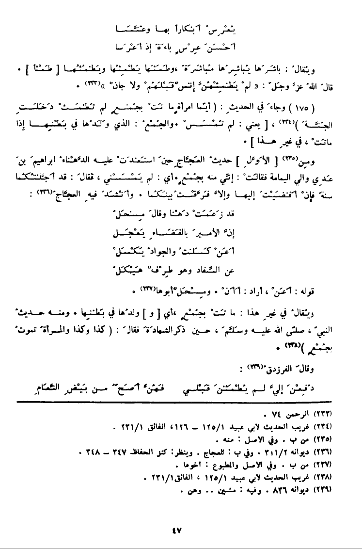 يُعْرِسُ أَبْكاراً بهَا وعُنِّسَا أَحْسَنَ عِرْسٍ باءَةً إِذا أَعْرَسا ويُقالُ: باشَرَها يُباشِرُها مُباشَرَةً، وطَمَثَها يَطْمِثُها ويَطْمُثُها [طَمْثاً] . قالَ اللهُ عزَّ وجَلَّ: " لمْ يَطْمِثْهُنَّ إِنْسٌ قَبْلَهُمْ وَلَا جانٌ " (233) . (175) وجاءَ فِي الحديثِ: (أيّما امرأةٍ ماتَتْ بجُمْعٍ لم تُطْمَثْ دَخَلَتِ الجَنَّةَ) (234) ، [يَعْنِي: لم تُمْسَسْ. والجُمْعُ: الَّذِي وَلَدُها فِي بَطْنِها إِذا ماتَتْ، فِي غيرِ هَذَا] . ومِن (235) [الأَوَّلِ] حديثُ العَجَّاجِ حينَ استَعْدَتْ عَلَيْهِ الدَّهْناءُ إبراهيمَ بنَ عَدِي وَالِي الْيَمَامَة فقالَتْ: إنِّي مِنْهُ بجُمْعٍ. أَي: لم يَمْسَسْني، فقالَ: قد أَجَّلْتُكُما سنة فإنْ أَفْضَيْتَ إِلَيْهَا وإلاَّ فَرَّقْتُ بينَكُما. وأَنْشَدَ فيهِ العجَّاجُ (236) : قد زَعَمَتْ دَهْنا وقالَ مِسْحَلُ إنَّ الأميرَ بالقَضاَءِ يَعْجَل أَعَنْ كَسَلْتُ والجوادُ يَكْسَلْ عَن السِّفاد وَهُوَ طِرْفٌ هَيْكَلُ قَوْله: أَعَنْ، أَرَادَ: أَأَنْ. ومِسْحَلٌ أَبوهَا (237) . ويُقالُ فِي غيرِ هَذَا: ماتَتْ بجُمْعٍ، أَي [و] ولدُها فِي بَطْنِها. وَمِنْه حديثُ النبيّ، صلّى الله عَلَيْهِ وسَلَّمَ، حِين ذكر الشهادَةَ فقالَ: (كَذَا وَكَذَا والمرأةُ تموتُ بجُمْعٍ) (238) . وقالَ الفرزدق (239) : دُفِعْنَ إليَّ لم يُطْمَثْنَ قَبْلي فَهُنَّ أَصَحُّ من بَيْضِ النَّعَامِ