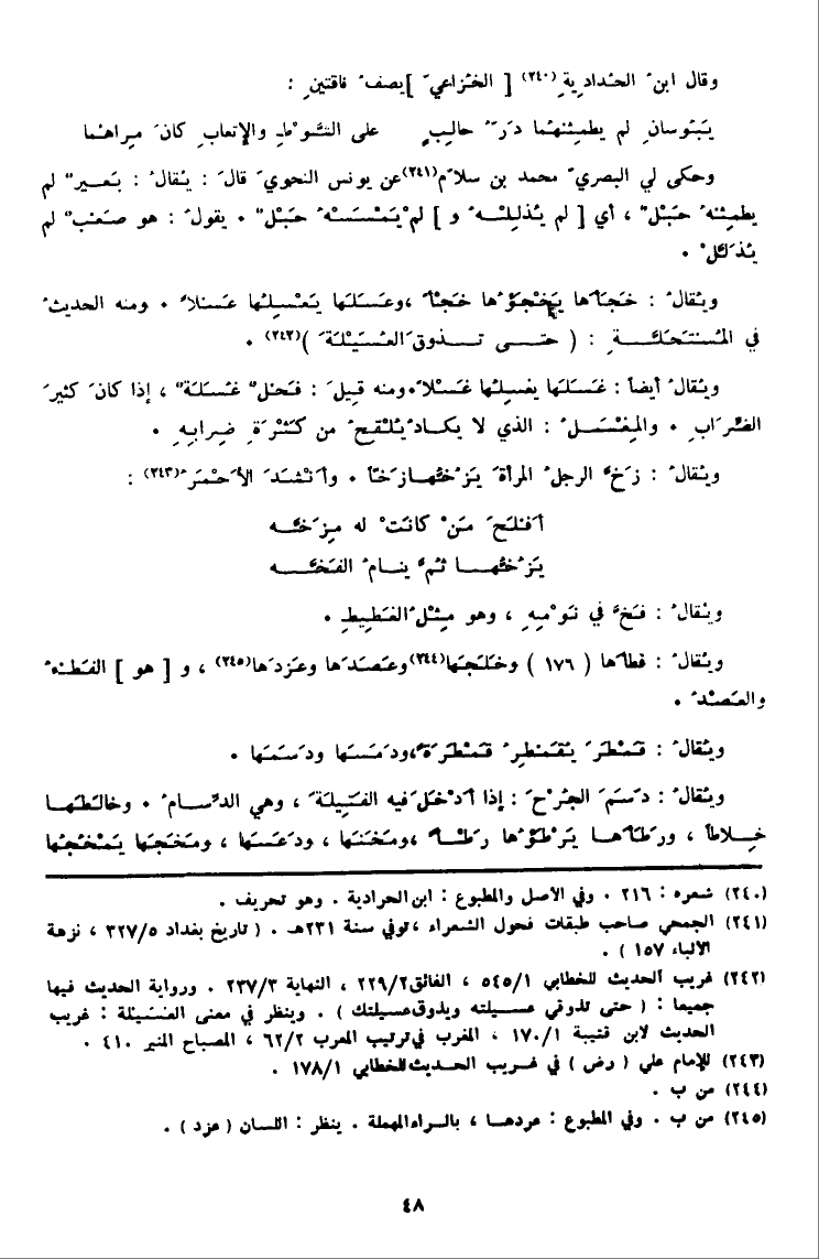 وَقَالَ ابنُ الحُدادِيةِ (240) [الخُزاعيّ] يصفُ ناقتينِ: يَبُوسانِ لم يطمِثْهُما دَرُّ حالِبٍ على الشَّوْطِ والإتعابِ كانَ مِراهُما وَحكى لي البصريّ مُحَمَّد بن سلاّم (241) عَن يُونُس النحويّ قالَ: يُقالُ: بَعيرٌ لم يطمِثْهُ حَبْلٌ، أَي [لم يُذلِلْهُ و] لمْ يَمْسَسْهُ حَبْلٌ. يقولُ: هُوَ صَعْبٌ لم يُذَلَّلْ. ويُقالُ: خَجَأَها يَخْجَؤُها خَجْأً، وعَسَلَها يَعْسِلُها عَسْلاً. وَمِنْه الحديثُ فِي المُسْتَحَلَّةِ: (حَتَّى تذوقَ العُسَيْلَةَ) (242) . ويُقالُ أَيْضا: غَسَلَها يغسِلُها غَسْلاً. وَمِنْه قِيلَ: فَحْلٌ غُسَلَةٌ، إِذا كانَ كثيرَ الضِّرَابِ. والمِغْسَلُ: الَّذِي لَا يكادُ يُلْقِحُ من كَثْرَةِ ضِرابِهِ. ويُقالُ: زَخَّ الرجلُ المرأةَ يَزُخُّها زَخًّا. وأَنْشَدَ الأَحْمَرُ (243) : أَفْلَحَ مَنْ كانَتْ لَهُ مِزَخَّه يَزُخُّها ثُمَّ ينامُ الفَخَّه ويُقالُ: فَخَّ فِي نَوْمِهِ، وَهُوَ مِثْلُ الغِطِيطِ. ويُقالُ: قَطأها (176) وخَلَجَها (244) وعَصَدَها وعَزدَها (245) ، و [هُوَ] الفَطْءُ والعَصْدُ. ويُقالُ: قَمْطَرَ يُقَمْطِرُ قَمْطَرَةً، ودَمَسَها ودَسَمَها. ويُقالُ: دَسَمَ الجُرْحَ: إِذا أَدْخَلَ فِيهِ الفَتِيلَةَ، وَهِي الدِّسامُ. وخالَطَها خِلاطاً، ورَطَأَها يَرْطَؤُها رَطْاً، ومَخَنَها، ودَعَسَها، ومَخَجَها يَمْخُجُها