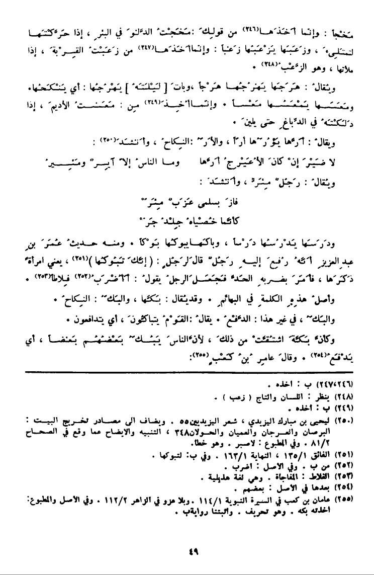 مَخْجاً: وإنّما أَخَذَها (246) من قولِكَ: مَخَجْتُ الدَّلْوَ فِي البئرِ، إِذا حَرَّكْتَها لتمتَلِئَ، وزَعَبَها يَزْعَبُها زَعْباً: وإنّما أَخَذَها (247) من زَعَبْتُ القِرْبةَ، إِذا ملأتها، وَهُوَ الزَّعْبُ (248) . ويُقالُ: هَرَجَها يَهْرُجُها هَرْجاً، وباتَ [لَيْلَتَهُ] يَهْرُجُها: أَي يَنْكَحُها. ومَعَسَها يَمْعَسُها مَعْساً. وإنّما أُخِذَ (249) مِن: مَعَسْتُ الأديمَ، إِذا دَلَكْتَهُ فِي الدِّباغِ حَتَّى يلينَ. ويقالُ: أَرَّها يَؤُرُّها أرّاً، والأَرُّ: النِكاحُ، وأَنْشَدَ (250) : لَا ضَيْرَ إنْ كانَ الأُعَيْرِجُ أَرَّها وَمَا الناسُ إلاّ آيِرٌ ومَئِيرُ ويُقالُ: رَجُلٌ مِئَرٌّ، وأَنْشَدَ: فازَ بسلمى عَزَبٌ مِئَرّْ كأنَّما خُصْياهُ جِلْدُ جَرّْ ودَرَسَها يَدْرُسُها دَرْساً، وباكَها يبوكُها بَوْكاً. وَمِنْه حديثُ عُمَرَ بنِ عبد العزيزِ أَنَّهُ رُفِعَ إليهِ رَجُلٌ قالَ لِرَجُلٍ: (إنَّكَ تَبُوكُها) (251) ، يَعْنِي امْرَأَة ذَكَرَها، فأَمَرَ بضربهِ الحَدَّ فَجَعَلَ الرجلُ يقولُ: أَأُضْرَبُ (252) فِلاطاً (153) . وأصلُ هذِهِ الكلمةِ فِي البهائمِ. وَقد يُقال: بَكَّها، والبَكُّ: النِكاحُ. والبَكَّ، فِي غير هَذَا: الدَّفعُ. يُقَال: القَوْمُ يتباكَّونَ، أَي يتدافعون. وكأنَّ بَكَّةَ اشتُقَّتْ من ذلكَ، لأنَّ الناسَ يَبُكُّ بَعْضُهُم بَعْضاً، أَي يَدْفَعُ (254) . وقالَ عامِرُ بنُ كَعْبٍ (255) :