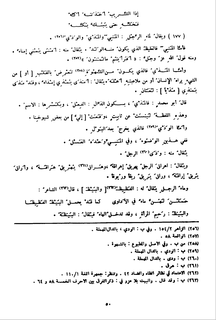 إِذا الشَّرِيبُ أَخَذَتْهُ أَكَّهْ فَخَلِّهِ حَتَّى يَبُكَّ بَكَّهْ (177) ويقالُ لماءِ الرَّجُلِ: المَنِيُّ والمَذْيُ والوَذْيُ (256) . فأمَّا المَنِيُّ فالغليظُ الَّذِي يكونُ مِنْهُ الوَلَدُ. يُقالُ مِنْهُ: أَمْنَى يُمْني إمناءً. وَمِنْه قولُ اللهِ عزّ وجَلَّ: " أَفَرأَيتُمُ مَا تُمْنُونَ " (257) . وأمَّا المَذْيُ فَالَّذِي يكونُ من الشَّهْوَةِ (258) تَعْرِضُ بالقَلْبِ [أَو] من الشيءِ يراهُ الإنسانُ أَو من ملاعبتِهِ أَهْلَهُ. يُقالُ: أَمْذَى يُمْذِي إمْذاءً، وقَدْ مَذَى يَمْذِي [مَذْياً] : لُغَتانِ. قالَ أَبُو محمدٍ: فالمَذْيُ، بِسُكُون الذَّالِ: الفِعْلُ، وبكَسْرِها: الاسمُ. وهذِهِ اللفظةُ لَيْسَتْ عَن ثابِتٍ، وَقَعَتْ [إليَّ] من بعضِ شيوخِنا. وأَمَّا الوَذْيُ (259) فَالَّذِي يخرجُ بعدَ البَوْلِ. فَفِي هذينِ الوُضُوءُ، وَفِي المَنِيِّ وَحْدَهُ الغَسْلُ. يُقالُ مِنْهُ: وَذَى (260) الرجلُ. ويُقالُ: اهراقَ الرجلُ يهريقُ إهراقةً، وهَراق (261) يُهْرِيقُ هَراقَةً، وأَراقَ يُريقُ إراقَةً، وراقَ يَرِيقُ ريقاً ورُيوقاً. وماءُ الرجلِ يُقالُ لَهُ: الفَظِيظُ (262) [والبَيْظُ] ، قَالَ (263) الشاعرُ: حَمَلْنَ لَهُنَّ مَاء فِي الأَداوي كَمَا قَدْ يحملُ البَيْظُ الفَظِيظَا والبَيْظُ: رَحِمُ المرأةِ، وَقد تدخلُ الهاءُ فيُقالُ: البَيْظَةُ.