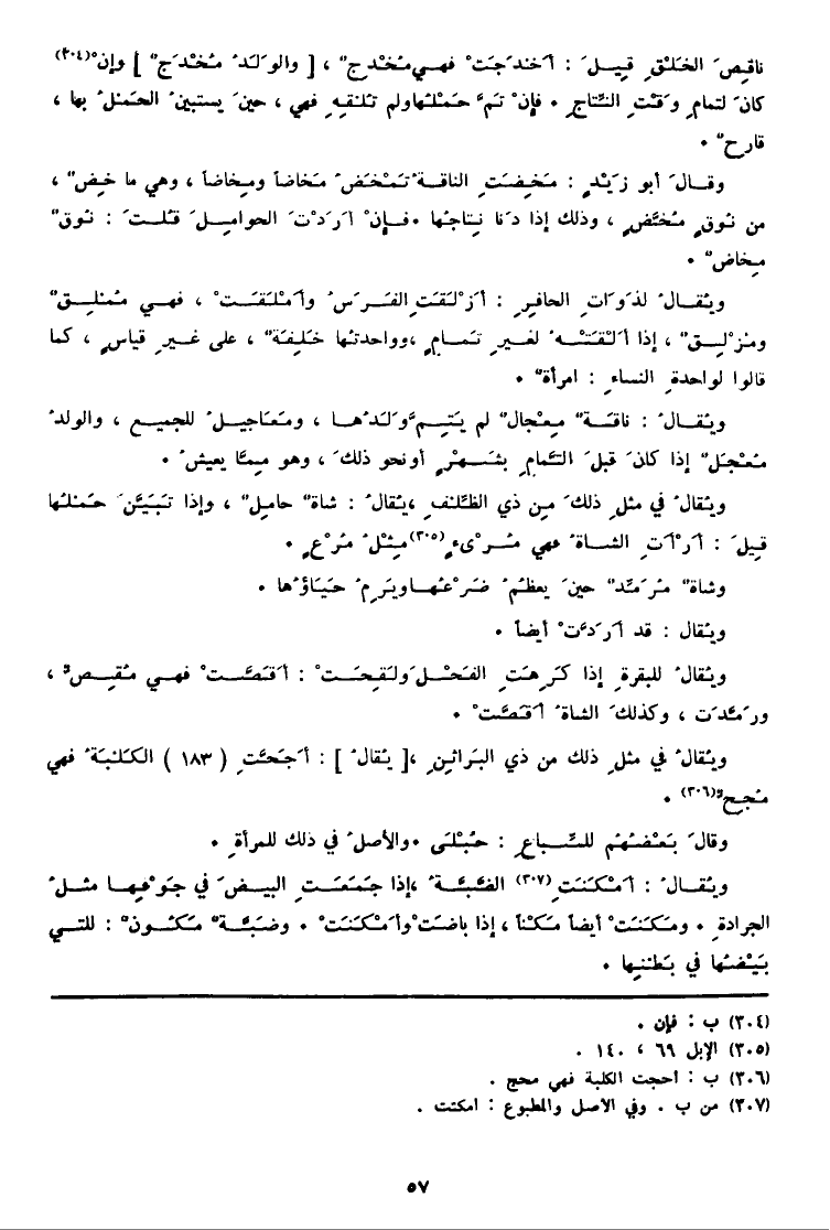 ناقِصَ الخَلْقِ قِيلَ: أَخْدَجَتْ فَهِيَ مُخْدِجٌ، [والوَلَدُ مُخْدَجٌ] وإنْ (304) كانَ لتمامِ وَقْتِ النِّتاجِ. فإِنْ تَمَّ حَمْلُها وَلم تُلْقِهِ فَهِيَ، حينَ يستبينُ الحَمْلُ بهَا، قارِحٌ. وقالَ أَبُو زَيْدٍ: مَخِضَتِ الناقةُ تَمْخَضُ مَخاضاً ومِخاضاً، وَهِي مَا خِصٌ، من نُوقٍ مَخَّضٍ، وَذَلِكَ إِذا دَنا نِتاجُها. فإِنْ أَرَدَتْ الحوامِلَ قُلتَ: نُوقٌ مِخاضٌ. ويُقالُ لذَوَاتِ الحافِرِ: أَزْلَقَتِ الفَرَسُ وأَمْلَقَتْ، فَهِيَ مُمْلِقٌ ومُزْلِقٌ، إِذا أَلْقَتْهُ لغيرِ تَمامٍ، وواحدتُها خَلِفَةٌ، على غيرِ قياسٍ، كَمَا قَالُوا لواحدةِ النساءِ: امرأةٌ. ويُقالُ: ناقَةٌ مِعْجالٌ لم يَتِمَّ وَلَدُها، ومَعَاجيلُ للْجَمِيع، والولدُ مُعْجَلٌ إِذا كانَ قبلَ التّمامِ بشَهْرٍ أَو نَحْو ذلكَ، وَهُوَ مِمَّا يعيشُ. ويُقالُ فِي مثلِ ذلكَ مِن ذِي الظِّلفِ، يُقالُ: شاةٌ حامِلٌ، وَإِذا تَبَيَّنَ حَمْلُها قِيلَ: أَرْأَتِ الشاةُ فَهِيَ مُرْئٍ (305) مِثْلُ مُرْعٍ. وشاةٌ مُرَمِّدٌ حينَ يعظُمُ ضَرْعُها ويَرِمُ حَيَاؤُها. ويُقالُ: قد أَرَدَّتْ أَيْضا. ويُقالُ للبقرةِ إِذا كَرِهَتِ الفَحْلِ ولَحِقَتْ: أَقَصَّتْ فَهِيَ مُقِصٌّ، ورَمَّدَت، وكذلكَ الشاةُ أَقَصَّتْ. ويُقالُ فِي مثلِ ذَلِك من ذِي البَراثِنِ، [يُقالُ] : أَجَحَّتْ (138) الكَلْبَةُ فَهِيَ مُجِحٌّ (306) . وقالَ بَعْضُهُم للسِّباعِ: حُبْلَى. والأصلُ فِي ذَلِك للمرأةِ. ويُقالُ: أَمْكَنَتِ (307) الضَّبَّةُ، إِذا جَمَعَتِ البيضَ فِي جَوْفِها مثلُ الجرادةِ. ومَكَنَتْ أَيْضا مَكْناً، إِذا باضَتْ وأَمْكَنَتْ. وضَبَّةٌ مَكُونٌ: للَّتِي بَيْضُها فِي بَطْنِها.